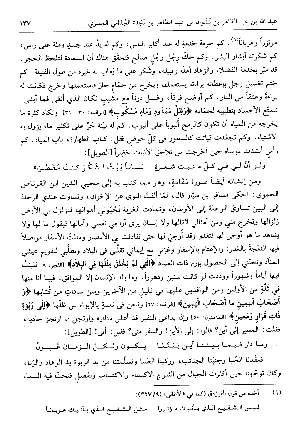 مؤتزراً وعرياناً كم حُرْمَة خدمةٍ لَهُ عِنْد أكَابِر النَّاس وَكم لَهُ يدٌ عِنْد جسدٍ وَمِنْه على راس كم شكرته أبشار الْبشر وَكم حك رجل رجل رجلٍ صَالح فتحقق هُنَاكَ أَن السَّعَادَة لتلحظ الْحجر قد ميز بخدمه الْفُضَلَاء والزهاد أَهله وقبيله شكر على مَا يعاب بِهِ غَيره من طول الفتيلة كم ختم تغسيل رجل بإعطائه بَرَاءَته يستعملها وَيخرج من حمامٍ حَار فاستعملها وَخرج فَكَانَت بِهِ برءة وعتقاً بالنَّار كم أوضح فرقا وَغسل درناً مَعَ مشيبٍ فَكَانَ الَّذِي أنقى فَمَا أبقى تتمتع الأجساد بتطييبه لحمامه بظلٍ مَمْدُود وَمَاء مسكوب وتكاد كَثْرَة مَا يُخرجهُ من الْمِيَاه أَن تكون كالرمح على أنبوباً على أنبوب كم لَهُ بَيِّنَة حر على تَكْثِير مَاء يَزُول بِهِ الِاشْتِبَاه وَكم تجعدت فباتت كالسطور فِي حوضٍ فَقل كتاب الطَّهَارَة بَاب الْمِيَاه كم رأسٍ أنشدت موساه حِين أخرجت من تلاحق الأنبات خضرًا من الطَّوِيل