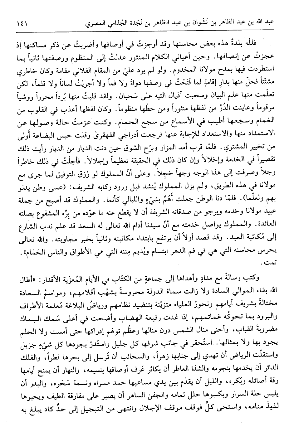 فَللَّه بلدةٌ هَذِه بعض محاسنها وَقد أوجزت فِي أوصافها وأضربت عَن ذكر مساكنها إِذْ عجزت عَن إنصافها وَحين أعياني الْكَلَام المنثور عدلت إِلَى المنظوم ووصفتها ثَانِيًا بِمَا استطردت فِيهَا بمدح مَوْلَانَا المخدوم وَلَو لم يرد عَليّ من الْمقَام الْفُلَانِيّ مقامة وَكَانَ خاطري مشتتاً فَحل مِنْهَا بدار إِقَامَة لما فتحت فِي وصفهَا دَوَاة وَلَا فَمَا وَلَا أجريت لِسَانا وَلَا قَلما لَكِن تعلمت مِنْهَا علم الْبَيَان وسحبت أذيال التيه على سحبان وَلَقَد قلبت مِنْهَا بردا محرراً ووشياً مرقوماً وعاينت الدّرّ من لَفظهَا منثوراً وَمن حظها منظوماً وَكَانَ لَفظهَا أعذب الْقُلُوب من الْغَمَام وسجعها أطيب فِي الأسماع من سجع الْحمام وَكنت عزمت حَالَة وصولها على الاستمداد مِنْهَا والاستعداد للإجابة عَنْهَا فَرَجَعت أدراجي الْقَهْقَرِي وَقلت حبس البضاعة أولى من تَخْيِير المُشْتَرِي فَلَمَّا قرب أمد المزار وبرح الشوق حِين دنت الديار من الديار رَأَيْت ذَلِك تقصيراً فِي الْخدمَة وإخلالاً وَإِن كَانَ ذَلِك فِي الْحَقِيقَة تَعْظِيمًا وإجلالاً ز فأجلت فِي ذَلِك خاطراً وجلاً وصرفت إِلَى هَذَا الْوَجْه وَجها خجلاً وعَلى أَن الْمَمْلُوك لَو رزق التَّوْفِيق لما جرى مَعَ مَوْلَانَا فِي هَذِه الطَّرِيق وَلم يزل الْمَمْلُوك ينشد قبل وُرُود ركابه الشريف عَسى وَطن يدنو بهم ولعلما فَلَمَّا دنا الوطن جعلت أهم بشيءٍ والليالي كَأَنَّمَا والمملوك قد أصبح من جملَة عبيد مَوْلَانَا وخدمه ويرجو من صدقاته الشَّرِيفَة أَن لَا يقطع عَنهُ مَا عوده من بره الْمَشْفُوع بصلته العائدة والمملوك يواصل خدمته مَعَ أَن سيدنَا أدام الله تَعَالَى لَهُ السعد قد علم ندب الشَّارِع إِلَى مُكَاتبَة العَبْد وَقد قصد أَولا أَن يرْتَفع بابتداء مُكَاتبَته وَثَانِيا بِخَبَر مجاوبته وَالله تَعَالَى يحرس محاسنه الَّتِي هِيَ فِي فَم الدَّهْر ابتسام ويديم مننه الَّتِي هِيَ الأطواق وَالنَّاس الْحمام تمت