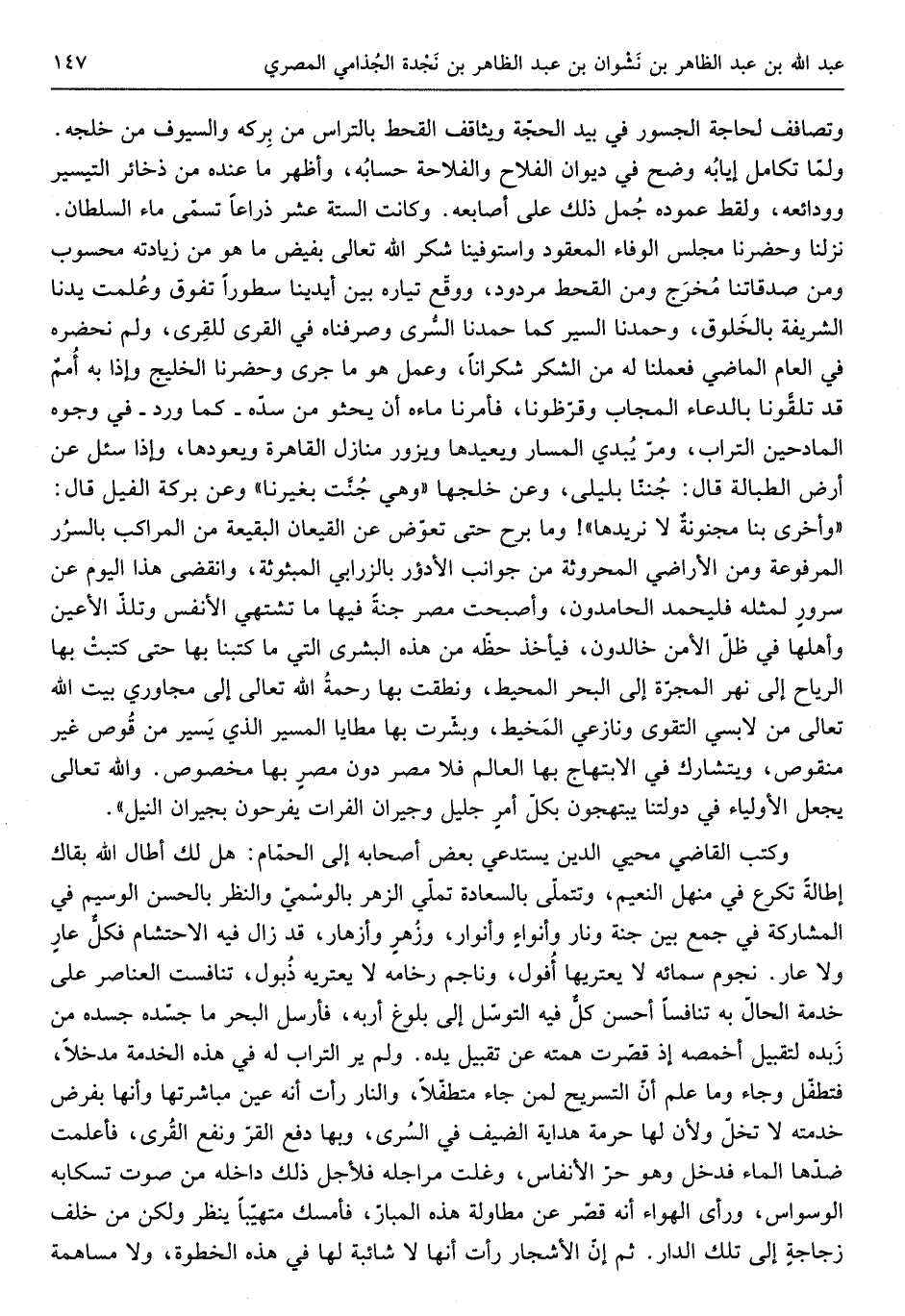 وتصافف لحَاجَة الجسور فِي بيد الْحجَّة ويثاقف الْقَحْط بالتراس من بركه وَالسُّيُوف من خلجه وَلما تَكَامل إيابه وضح فِي ديوَان الْفَلاح والفلاحة حسابه وَأظْهر مَا عِنْده من خسائر التَّيْسِير وودائعه ولقط عموده جمل ذَلِك على أَصَابِعه وَكَانَت السِّتَّة عشر ذِرَاعا تسمى مَاء السُّلْطَان نزلنَا وحصرنا مجْلِس الْوَفَاء الْمَعْقُود واستوفينا شكر الله تَعَالَى بفيض ماهو من زِيَادَته مَحْسُوب وَمن صَدَقَاتنَا مخرج وَمن الْقَحْط مَرْدُود وَوَقع تياره بَين أَيْدِينَا سطوراً تفوق وَعلمت يدنا الشَّرِيفَة بالخلوق وحمدنا السّير كَمَا حمدنا السرى وصرفناه فِي الْقرى للقرى وَلم نحضره فِي الْعَام الْمَاضِي فَعلمنَا لَهُ من الشُّكْر شكراناً وَعمل هُوَ مَا جرى وحضرنا الخليج إِذا بِهِ أُمَم قد تلقونا بِالدُّعَاءِ المجاب وقرظونا فَأمرنَا مَاءَهُ أَن يحثو من سَده كَمَا ورد فِي وُجُوه المادحين التُّرَاب وَمر يُبْدِي المسار وَيُعِيدهَا ويزور منَازِل الْقَاهِرَة ويعودها وَإِذا سُئِلَ عَن أَرض الطبالة قَالَ جُننا بليلى وَعَن خلجها وَهِي جنت بغيرنا وَعَن بركَة الْفِيل قَالَ وَأُخْرَى بِنَا مَجْنُونَة لَا نريدها وَمَا برح حَتَّى تعوض عَن القيعان البقيعة من المراكب بالسرر المرفوعة وَمن الْأَرَاضِي المحروثة من جَوَانِب الأدؤر بالزرابي المبثوثة وانقضى الْيَوْم هَذَا عَن سرورٍ لمثله فليحمد الحامدون وأصبحت مصر جنَّة فِيهَا مَا تشْتَهي الْأَنْفس وتلذ الْأَعْين وَأَهْلهَا فِي ظلّ الْأَمْن خَالدُونَ فَيَأْخُذ حَظه من هَذِه الْبُشْرَى الَّتِي مَا كتبنَا بهَا حَتَّى كتبت بهَا الرِّيَاح إِلَى نهر المجرة إِلَى الْبَحْر وَالْمُحِيط ونطقت بهَا رَحْمَة الله تَعَالَى إِلَى مجاوري بَيت الله تَعَالَى من لابسي التَّقْوَى ونازعي الْمخيط وبشرت بهَا مطايا الْمسير الَّذِي يسير من قوص غير مَنْقُوص ويتشارك فِي الابتهاج بهَا الْعَالم فَلَا مصر دون)
