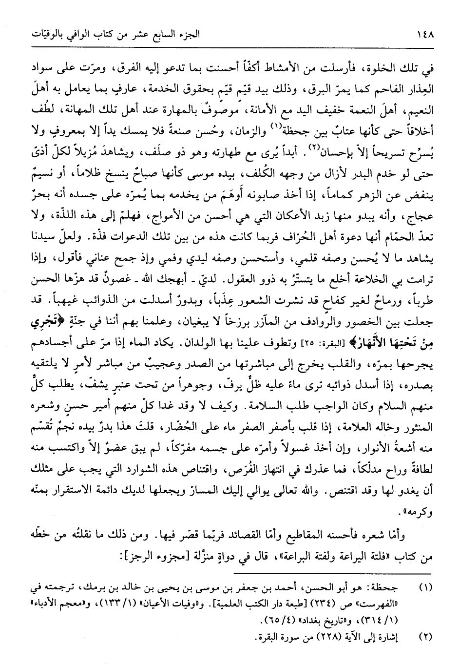 فِي تِلْكَ الْخلْوَة فَأرْسلت من الأمشاط أكفاً أَحْسَنت بِمَا تَدْعُو إِلَيْهِ الْفرق وَمَرَّتْ على سَواد العذار الفاحم كَمَا يمر الْبَرْق وَذَلِكَ بيد قيمٍ قيمٍ بِحُقُوق الْخدمَة عارفٍ بِمَا يُعَامل بِهِ أهل النَّعيم أهل النِّعْمَة خَفِيف الْيَد مَعَ الْأَمَانَة موصوفٌ بالمهارة عِنْد أهل تِلْكَ المهانة لطف أَخْلَاقًا حَتَّى كَأَنَّهَا عتابٌ بَين جحظة وَالزَّمَان وَحسن صنعه فَلَا يمسك يدا إِلَّا بمعروفٍ وَلَا يسرح تسريحاً إِلَّا بِإِحْسَان أبدا يرى من طَهَارَته وَهُوَ ذُو صلف ويشاهد مزيلاً لكل أَذَى حَتَّى لَو خدم الْبَدْر لأزال وَجهه الكلف بِيَدِهِ مُوسَى كَأَنَّهَا صباحٌ ينْسَخ ظلاماً أَو نسيم ينفض عَن الزهر كماماً إِذا أَخذ صابونه أوهم من يَخْدمه بِمَا يمره على جسده أَنه بحرٌ عجاج وَأَنه يَبْدُو مِنْهَا زبد الأعكان الَّتِي هِيَ أحسن من الأمواج فَلهم إِلَى هَذِه اللَّذَّة وَلَا تعد الْحمام أَنَّهَا دَعْوَة أهل الحراف فَرُبمَا كَانَت هَذِه من بَين تِلْكَ الدَّعْوَات فذة وَلَعَلَّ سيدنَا يُشَاهد مَا لَا يحسن وَصفه قلمي وأستحسن وَصفه ليدي وفمي إِذْ جمح عناني فَأَقُول وَإِذا ترامت بِي الخلاعة أَخْلَع مَا يتستر بِهِ ذَوُو الْعُقُول لديّ أبهجك الله غصونٌ قد هزها الْحسن طَربا ورماحٌ لغير كفاحٍ قد نشرت الشُّعُور عذباً وبدورٌ أسدلت من الذوائب غيهباً قد جعلت بَين الخصور والروادف)