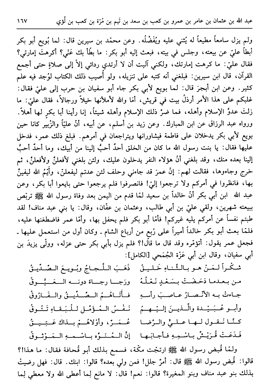 وَعَن زيد بن أسلم عَن أَبِيه أَن عليا وَالزُّبَيْر كَانَا حِين بُويِعَ لأبي بكر يدخلَانِ على فَاطِمَة فيشاورانها ويتراجعان فِي أَمرهم فَبلغ ذَلِك عمر فَدخل عَلَيْهَا فَقَالَ يَا بنت سَوَّلَ الله مَا كَانَ من الْخلق أحدٌ أحب إِلَيْنَا من أَبِيك وَمَا أحدٌ أحب إِلَيْنَا بعده مِنْك وَقد بَلغنِي أَن هَؤُلَاءِ النَّفر يدْخلُونَ عَلَيْك وَلَئِن بَلغنِي لَأَفْعَلَنَّ وَلَأَفْعَلَن ثمَّ خرج وجاءوها فَقَالَت لَهُم إِن عمر قد جَاءَنِي وَحلف لَئِن عدتم ليفعلن وأيم الله ليفين بهَا فانظروا فِي أَمركُم وَلَا ترجعوا إِلَيّ فانصرفوا فَلم يرجِعوا حَتَّى بَايعُوا أَبَا بكر وَعَن عبد الله بن أبي بكر أَن خَالِدا بن سعيد لما قدم من الْيمن بعد وَفَاة سَوَّلَ الله صلى الله عَلَيْهِ وَسلم تربص ببيعته شَهْرَيْن وَلَقي عَليّ بن أبي طَالب وَعُثْمَان بن عَفَّان وَقَالَ يَا بني عبد منَاف لقد طبتم نفسا عَن أَمركُم يَلِيهِ غَيْركُمْ فَأَما أَبُو بكر فَلم يحفل بهَا وَأما عمر فأضطغنها عَلَيْهِ فَلَمَّا بعث أَبُو بكر خَالِدا أَمِيرا على ربعٍ من أَربَاع الشَّام وَكَانَ أول من اسْتعْمل عَلَيْهَا فَجعل عمر يَقُول أتؤمره وَقد قَالَ مَا قَالَ فَلم يزل بِأبي بكر حَتَّى عَزله وَولى يزِيد بن أبي سُفْيَان وَقَالَ ابْن أبي عزة الجُمَحِي من الْكَامِل