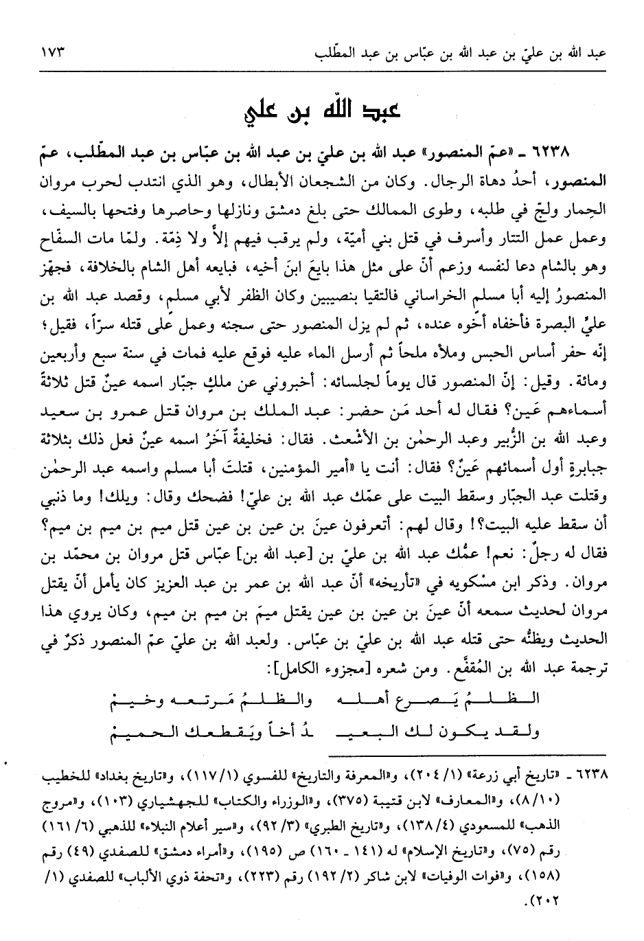 عَم الْمَنْصُور عبد الله بن عَليّ بن عبد الله بن عَبَّاس بن عبد الْمطلب عَم الْمَنْصُور أحد دهاة الرِّجَال وَكَانَ من الشجعان الْأَبْطَال وَهُوَ الَّذِي انتدب لِحَرْب مَرْوَان الْحمار ولج فِي طلبه وطوى الممالك حَتَّى بلغ دمشق ونازلها وحاصرها وَفتحهَا بِالسَّيْفِ وَعمل عمل التتار وأسرف فِي قتل بني أُميَّة وَلم يرقب فيهم إلاًّ وَلَا ذمَّة وَلما مَاتَ السفاح وَهُوَ بِالشَّام دَعَا لنَفسِهِ وَزعم أَن على مثل هَذَا بَايع ابْن أَخِيه فَبَايعهُ أهل الشَّام بالخلافة فَجهز الْمَنْصُور إِلَيْهِ أَبَا مُسلم الْخُرَاسَانِي فَالْتَقَيَا بنصيبين وَكَانَ الظفر لأبي مسلمٍ وَقصد عبد الله بن عَليّ الْبَصْرَة فأخفاه أَخُوهُ عِنْده ثمَّ لم يزل الْمَنْصُور حَتَّى سجنه وَعمل على قَتله سرا فَقيل إِنَّه جفر أساس الْحَبْس وملأه ملحاً ثمَّ أرسل المَاء عَلَيْهِ فَوَقع عَلَيْهِ فَمَاتَ سنة سبع وَأَرْبَعين وَمِائَة وَقيل إِن الْمَنْصُور قَالَ يَوْمًا لجلسائه أخبروني عَن ملكٍ جَبَّار اسْمه عينٌ قتل ثَلَاثَة أَسْمَاءَهُم عين فَقَالَ لَهُ أحد من حضر عبد الْملك بن مَرْوَان قتل عَمْرو بن سعيد وَعبد الله بن الزبير وَعبد الرحمان بن الْأَشْعَث