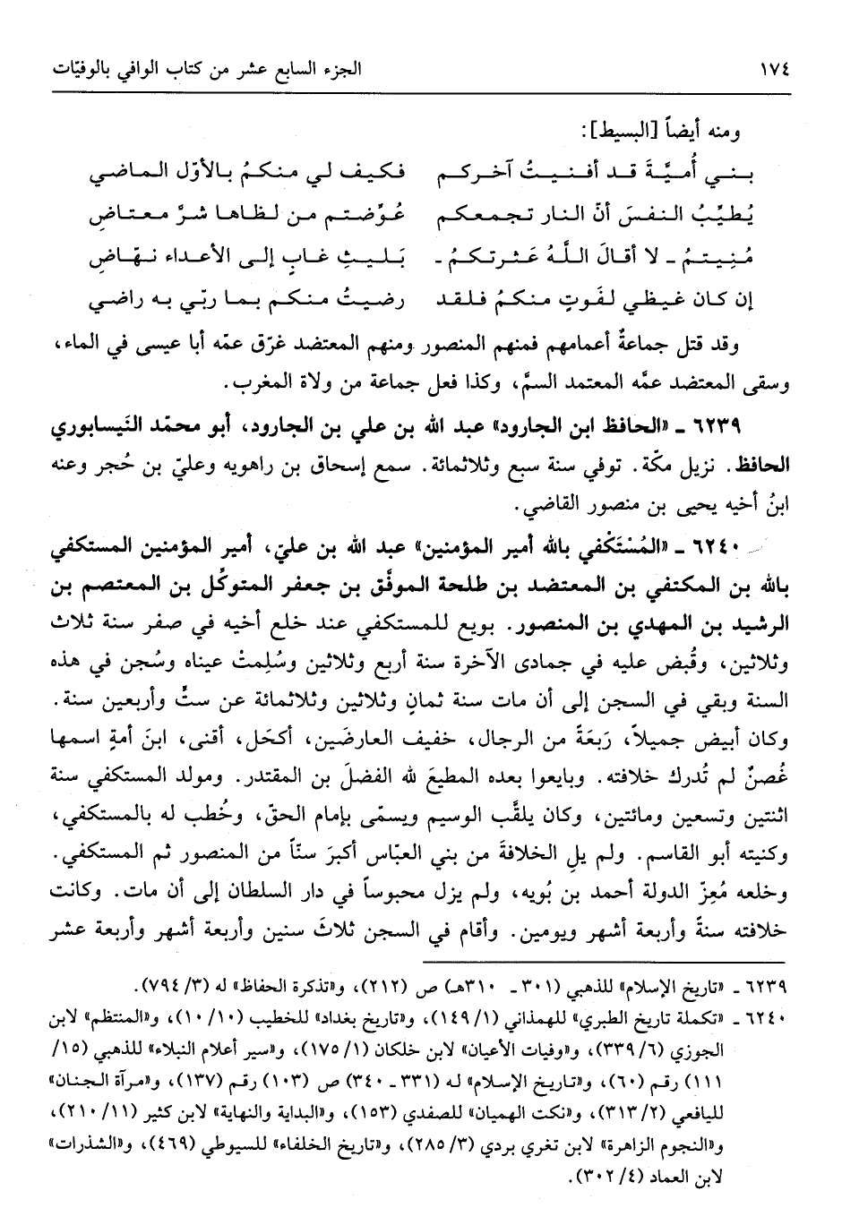 المستكفي بِاللَّه أَمِير الْمُؤمنِينَ عبد الله بن عَليّ أَمِير الْمُؤمنِينَ المستكفي بِاللَّه بن المكتفي بن المعتضد ابْن طَلْحَة الْمُوفق بن جَعْفَر المتَوَكل بن المعتصم بن الرشيد بن الْمهْدي بن الْمَنْصُور بُويِعَ للمستكفي عِنْد خلع أَخِيه فِي صفر ثَلَاث وَثَلَاثِينَ وَقبض عَلَيْهِ فِي جُمَادَى الْآخِرَة سنة أَربع وَثَلَاثِينَ وسملت عَيناهُ وسجن فِي هَذِه السّنة وَبَقِي فِي هَذَا السجْن إِلَى أَن مَاتَ سنة ثمانٍ وَثَلَاثِينَ وثلاثمائة عَن سِتّ وَأَرْبَعين سنة وَكَانَ أَبيض جميلاً ربعَة من الرِّجَال خَفِيف العارضين أكحل أقنى ابْن أمةٍ اسها غصنٌ لم تدْرك خِلَافَته وَبَايَعُوا بعده الْمُطِيع لله الْفضل بن المقتدر ومولد المستكفي سنة اثْنَتَيْنِ وَتِسْعين وَمِائَتَيْنِ وَكَانَ يلقب الوسيم يُسمى بِإِمَام الْحق وخطب لَهُ بالمستكفي وكنيته أَو الْقَاسِم وَلم يل الْخلَافَة من بني الْعَبَّاس أكبر سنا من الْمَنْصُور ثمَّ المستكفي وخلعه معز الدولة أَحْمد بن بويه وَلم يزل مَحْبُوسًا فِي دَار السُّلْطَان إِلَى أَن مَاتَ وَكَانَت خِلَافَته سنة وَأَرْبَعَة أشهر ويومين وَأقَام فِي السجْن ثَلَاث سِنِين وَأَرْبَعَة أشهر وَأَرْبَعَة عشر