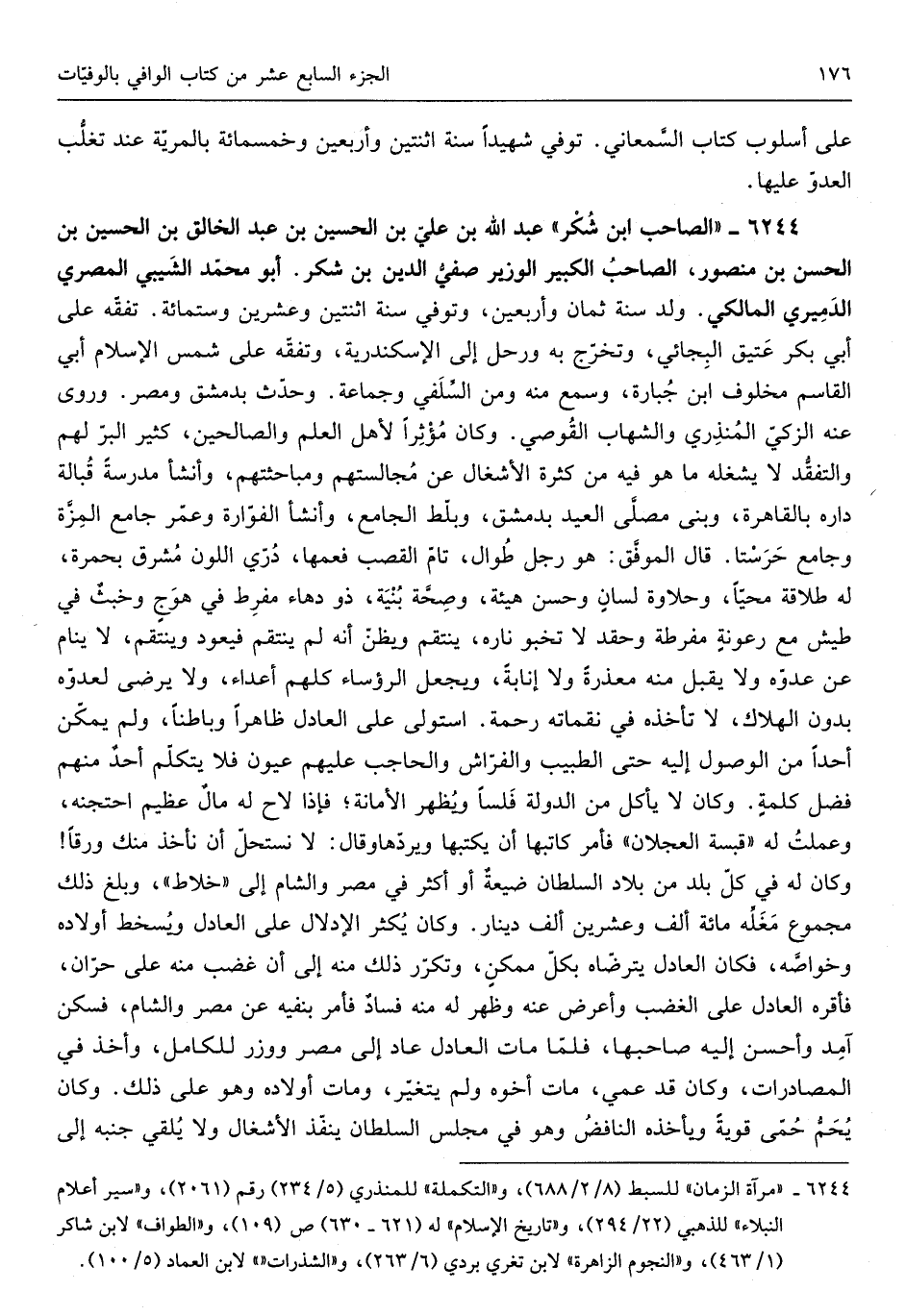 الصاحب ابْن شكر عبد الله بن عَليّ بن الْحُسَيْن بن عبد الْخَالِق بن الْحُسَيْن بن الْحسن بن الْمَنْصُور الصاحب الْكَبِير الْوَزير صفي الدّين بن شكر أَبُو مُحَمَّد الشيبي الْمصْرِيّ الدَّمِيرِيّ الْمَالِكِي ولد سنة ثَمَان وَأَرْبَعين وَتُوفِّي سنة اثْنَتَيْنِ وَعشْرين وسِتمِائَة تفق على أبي بكر عَتيق البجائي وَتخرج بِهِ ورحل إِلَى الْإسْكَنْدَريَّة وتفقه على شمس الْإِسْلَام أبي الْقَاسِم مخلوف بن جبارَة وَسمع مِنْهُ وَمن السلَفِي وَجَمَاعَة وَحدث بِدِمَشْق ومصر وروى عَنهُ الزكي الْمُنْذِرِيّ والشهاب القوصي وَكَانَ مؤثراً لأهل الْعلم وَالصَّالِحِينَ كثير الْبر لَهُم والتفقد لَا يشْغلهُ مَا هُوَ فِيهِ من)