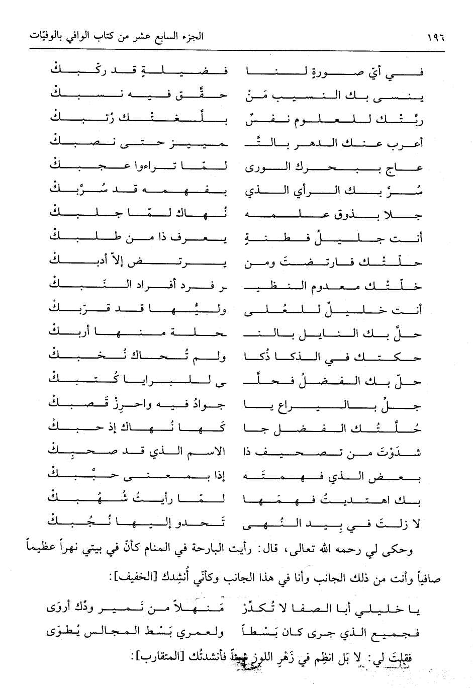 وَحكى لي رَحمَه الله تَعَالَى قَالَ رَأَيْت البارحة فِي الْمَنَام كَانَ فِي بَيْتِي نَهرا عَظِيما صافياً وَأَنت من ذَلِك الْجَانِب وَأَنا فِي هَذَا الْجَانِب وَكَأَنِّي أنْشدك من الْخَفِيف