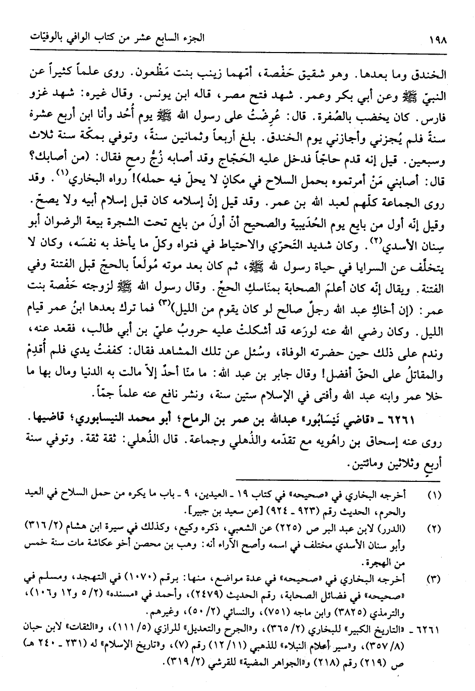 الخَنْدَق وَمَا بعْدهَا وَهُوَ شَقِيق حَفْصَة أمهَا زَيْنَب بنت مَظْعُون روى علما كثيرا عَن النَّبِي صلى الله عَلَيْهِ وَسلم وَعَن أبي بكر وَعمر شهد فتح مصر قَالَه ابْن يُونُس وَقَالَ غَيره شهد غَزْو فَارس كَانَ يخضب بالصفرة قَالَ عرضت على رَسُول الله صلى الله عَلَيْهِ وَسلم يَوْم أحد وَأَنا ابْن أَربع عشرَة سنة فَلم يجزني وأجازني يَوْم الخَنْدَق بلغ أَرْبعا وَثَمَانِينَ سنة وَتُوفِّي بِمَكَّة سنة ثَلَاث وَسبعين قيل إِنَّه قدم حَاجا فَدخل عَلَيْهِ الْحجَّاج وَقد أَصَابَهُ زج رمحٍ فَقَالَ من أَصَابَك قَالَ أصابني من أمرتوه بِحمْل السِّلَاح فِي مكانٍ لَا يحل فِيهِ حمله رَوَاهُ البُخَارِيّ وَقد روى الْجَمَاعَة كلهم لعبد الله بن عمر وَقد قيل إِن إِسْلَامه كَانَ قبل إِسْلَام أَبِيه وَلَا يَصح وَقيل إِنَّه أول من بَايع يَوْم الْحُدَيْبِيَة وَالصَّحِيح أَن أول من بَايع تَحت الشَّجَرَة بيعَة الرضْوَان أَبُو سِنَان الْأَسدي وَكَانَ شَدِيد التَّحَرِّي وَالِاحْتِيَاط فِي فتواه وكل مَا يَأْخُذ بِهِ نَفسه وَكَانَ لَا يتَخَلَّف عَن السَّرَايَا فِي حَيَاة رَسُول الله صلى الله عَلَيْهِ وَسلم ثمَّ كَانَ بعد مَوته مُولَعا بِالْحَجِّ قبل الْفِتْنَة وَفِي الْفِتْنَة وَيُقَال إِنَّه كَانَ أعلم الصَّحَابَة بمناسك الْحَج وَقَالَ رَسُول الله صلى الله عَلَيْهِ وَسلم لزوجته حَفْصَة بنت عمر إِن أَخَاك عبد الله رجلٌ صَالح لَو كَانَ يقوم من اللَّيْل فَمَا ترك بعْدهَا ابْن عمر قيام اللَّيْل وَكَانَ رَضِي الله عَنهُ لورعه قد اشكلت عَلَيْهِ حروب عَليّ بن أبي طَالب فَقعدَ عَنهُ وَنَدم على ذَلِك حِين حَضرته الْوَفَاة وَسُئِلَ عَن تِلْكَ الْمشَاهد فَقَالَ كَفَفْت يَدي فَلم أقدم والمقاتل على الْحق أفضل وَقَالَ جَابر ابْن عبد الله مَا منا أحدٌ إِلَّا مَالَتْ بِهِ الدُّنْيَا وَمَال بهَا خلا عمر وَابْنه عبد الله وَأفْتى فِي الْإِسْلَام سِتِّينَ سنة وَنشر نَافِع عَنهُ علما جماً