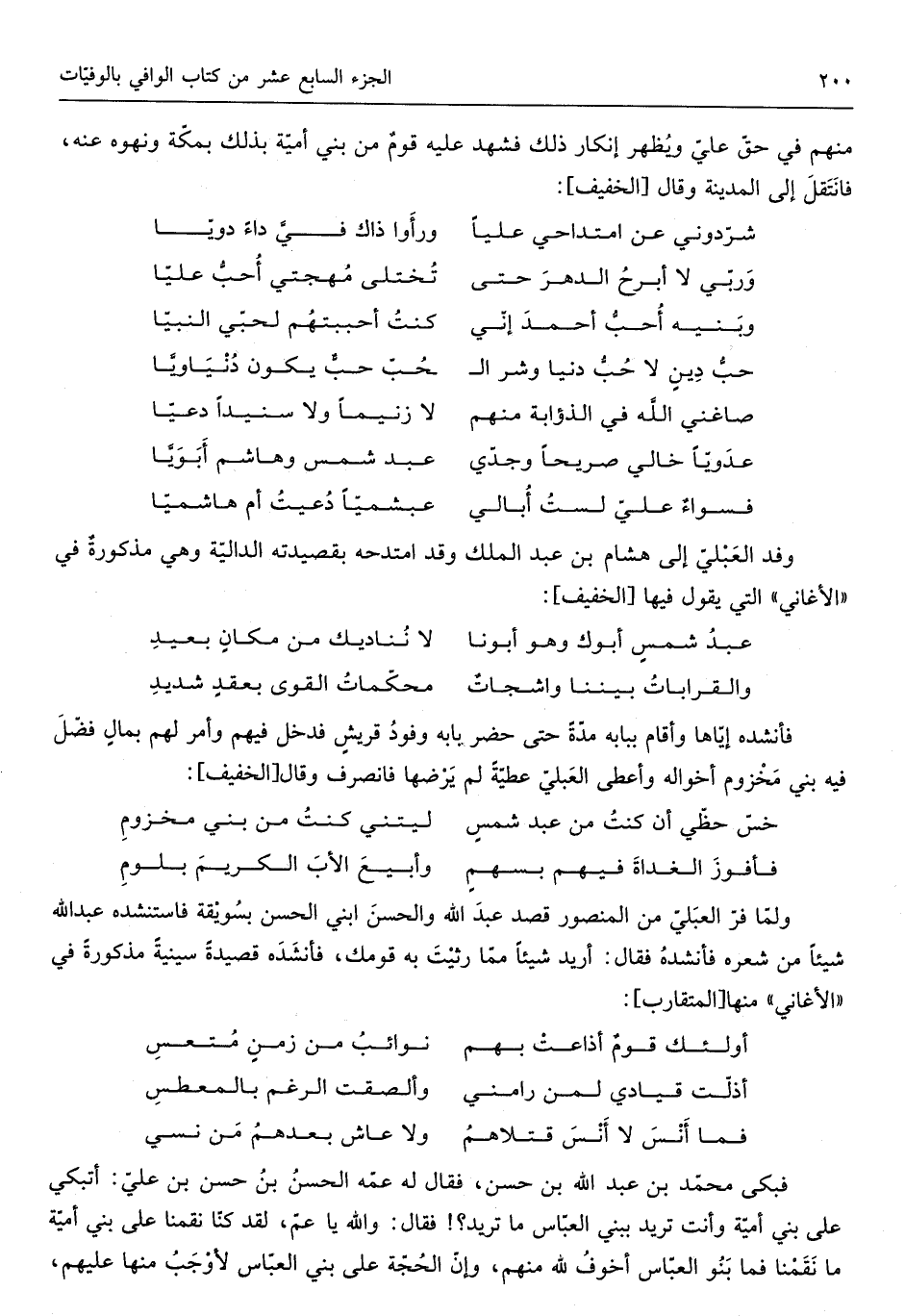 وَلما فر العبلي من الْمَنْصُور قصد عبد الله وَالْحسن ابْني الْحسن بسويقة فاستنشده عبد الله شَيْئا من شعره فأنشده فَقَالَ أُرِيد شَيْئا مِمَّا رثيت بِهِ قَوْمك فأنشده قصيدةً سينيةً مَذْكُورَة فِي الأغاني مِنْهَا من المتقارب