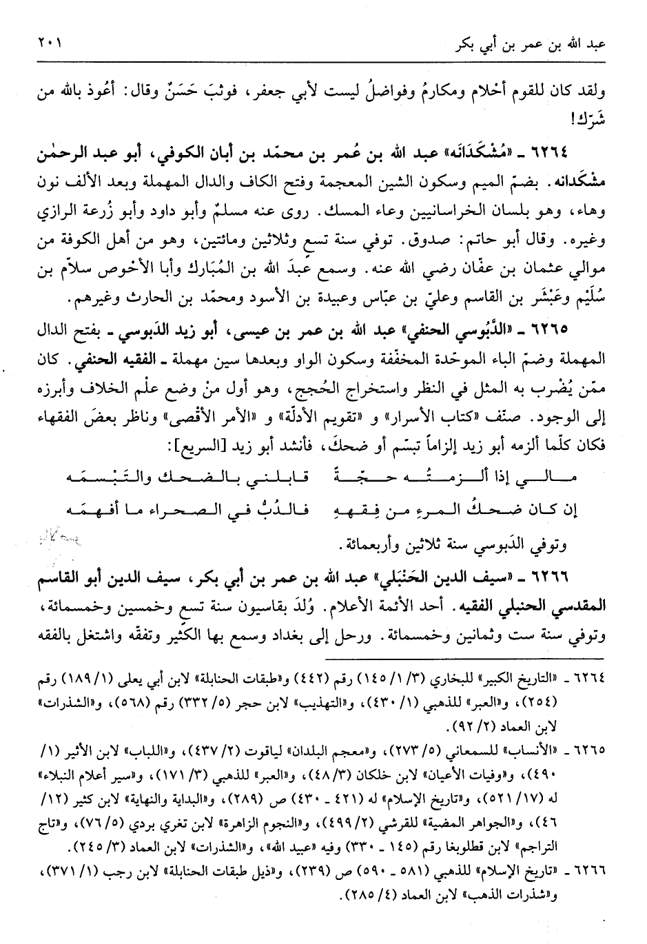 الدبوسي الْحَنَفِيّ عبد الله بن عمر بن عِيسَى أَبُو زيد الدبوسي بِفَتْح الدَّال الْمُهْملَة وَضم الْبَاء الْمُوَحدَة المخففة وَسُكُون الْوَاو وَبعدهَا السِّين مُهْملَة الْفَقِيه الْحَنَفِيّ كَانَ مِمَّن يضْرب بِهِ الْمثل فِي النّظر واستخرج الْحجَج وَهُوَ أول من وضع علم الْخلاف وأبرزه إِلَى الْوُجُود صنف كتاب الْأَسْرَار وتقويم الْأَدِلَّة وَالْأَمر الْأَقْصَى وناظر بعض الْفُقَهَاء فَكَانَ كلما ألزمهُ أَبُو زيد إلزاماً تَبَسم أَو ضحك فانشد أَبُو زيد من السَّرِيع
