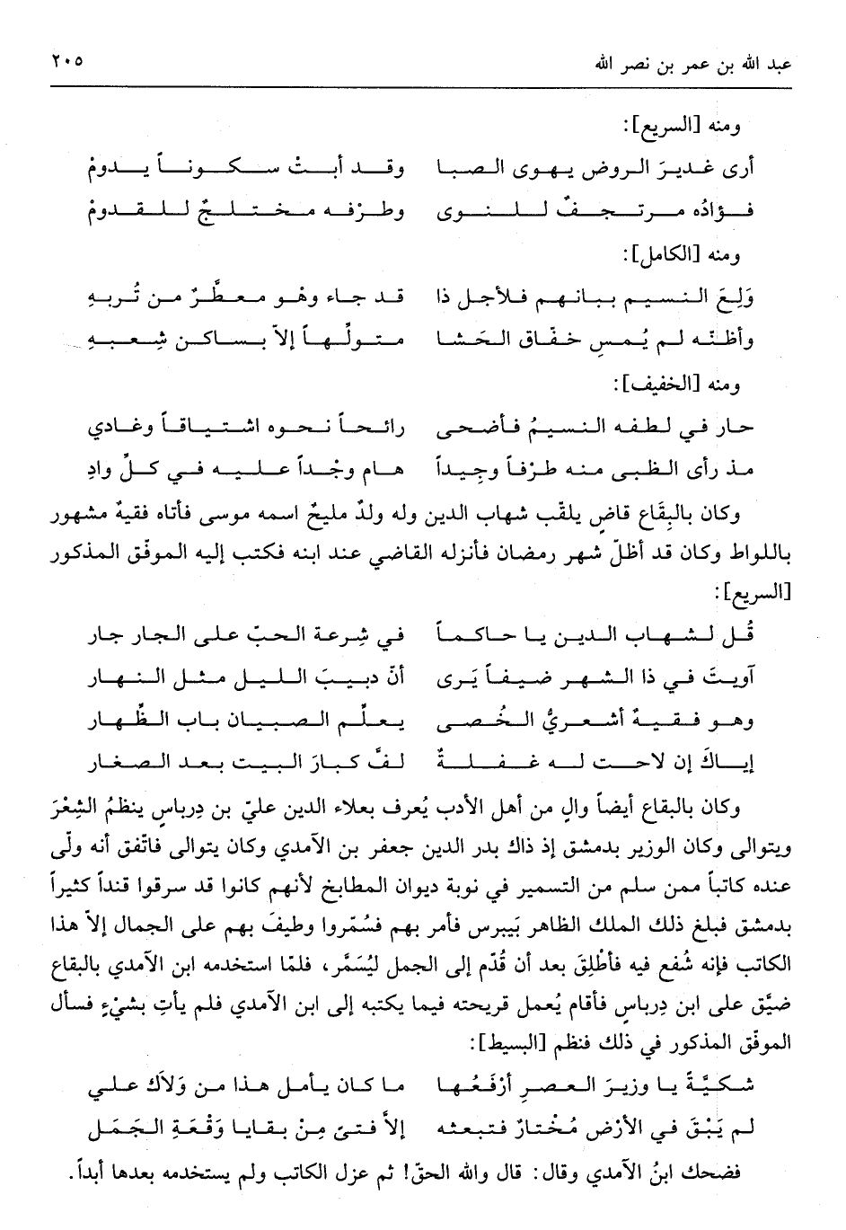وَكَانَ بالبقاع أَيْضا والٍ من أهل الْأَدَب يعرف بعلاء الدّين عَليّ بن درباسٍ بنظم الشّعْر ويتوالى وَكَانَ الْوَزير بِدِمَشْق إِذْ ذَاك بدر الدّين جَعْفَر ابْن الْآمِدِيّ وَكَانَ يتوالى فاتفق أَنه ولى عِنْده كَاتبا مِمَّن سلم من التسمير فِي نوبَة ديوَان المطابخ لأَنهم كَانُوا قد سرقوا قنداً كثيرا)