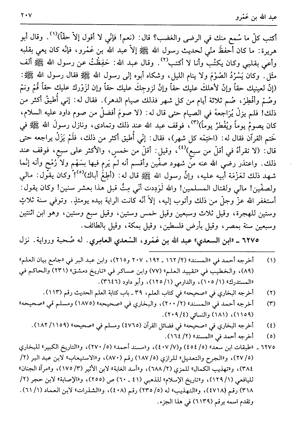أكتب كل مَا سمع مِنْك الرضى وَالْغَضَب قَالَ نعم فَإِنِّي لَا أَقُول إِلَّا حَقًا وَقَالَ أَبُو هُرَيْرَة مَا كَانَ أحفظ مني لحَدِيث رَسُول الله صلى الله عَلَيْهِ وَسلم إلاّ عبد الله بن عَمْرو فَإِنَّهُ كَانَ يعي بِقَلْبِه وأعي بقلبي وَكَانَ يكْتب وَأَنا لَا أكتب وَقَالَ عبد الله حفظت عَن رَسُول الله صلى الله عَلَيْهِ وَسلم ألف مثل وَكَانَ يسْرد الصَّوْم وَلَا ينَام اللَّيْل وشكاه أَبوهُ إِلَى رَسُول الله صلى الله عَلَيْهِ وَسلم فَقَالَ رَسُول الله صلى الله عَلَيْهِ وَسلم إِن لعينيك عَلَيْك حَقًا وَإِن لأهْلك عَلَيْك حَقًا وَإِن لزوجك عَلَيْك حَقًا وَإِن لزورك عَلَيْك حَقًا قُم ونم وصم وَأفْطر صم ثَلَاثَة أَيَّام من كل شهر فَذَلِك صِيَام الدَّهْر فَقَالَ لَهُ إِنِّي أُطِيق أَكثر من ذَلِك فَلم يزل يُرَاجِعهُ فِي الصّيام حَتَّى قَالَ لَهُ لَا صَوْم أفضل من صَوْم دَاوُد عَلَيْهِ السَّلَام كَانَ يَصُوم يَوْمًا وَيفْطر يَوْمًا فَوقف عبد الله عِنْد ذَلِك وَتَمَادَى ونازل رَسُول الله صلى الله عَلَيْهِ وَسلم فِي ختم الْقُرْآن فَقَالَ لَهُ إختمه فِي كل شهر فَقَالَ إِنِّي أُطِيق أَكثر من ذَلِك فَلم يزل يُرَاجِعهُ حَتَّى قَالَ لَا تَقْرَأهُ فِي أقل مَعَ سبعٍ قيل أقل من خمس وَالْأَكْثَر على سبع فَوقف عِنْد ذَلِك وَاعْتذر رَضِي الله عَنهُ من شُهُود صفّين وَأقسم أَنه لم يرم فِيهَا بسهمٍ وَلَا رمحٍ وَأَنه إِنَّمَا شهد ذَلِك لعزمة أَبِيه عَلَيْهِ وَإِن رَسُول الله صلى الله عَلَيْهِ وَسلم قَالَ لَهُ أطع أَبَاك وَكَانَ يَقُول مَالِي ولصفين مَالِي ولقتال الْمُسلمين وَالله لَوَدِدْت أَنِّي مت قبل هَذَا بِعشر سِنِين وَكَانَ يَقُول أسْتَغْفر الله عز وَجل من ذَلِك وَأَتُوب إِلَيْهِ إِلَّا أَنه كَانَت الرَّايَة بِيَدِهِ يومئذٍ وَتُوفِّي سنة ثلاثٍ وَسِتِّينَ لِلْهِجْرَةِ وَقيل ثَلَاث وَسبعين وَقيل خمس وَسِتِّينَ وَقيل سبع وَسِتِّينَ وَهُوَ ابْن اثْنَيْنِ وَسبعين سنة بِمصْر وَقيل بِأَرْض فلسطين وَقيل بِمَكَّة وَقيل بِالطَّائِف