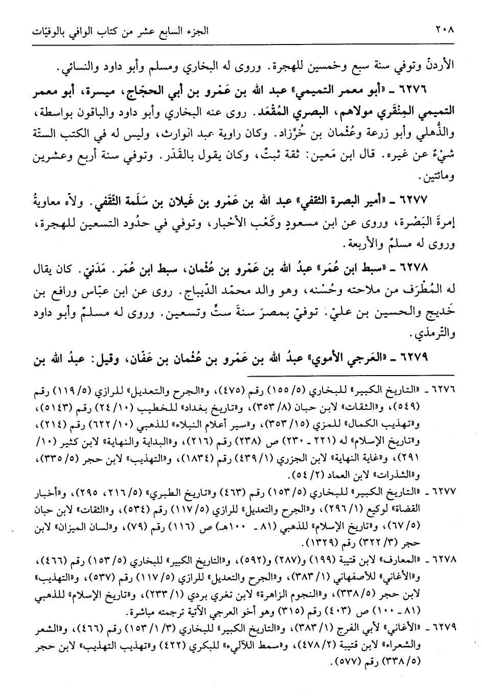 وَكَانَ رِوَايَة عبد الْوَارِث وَلَيْسَ لَهُ فِي الْكتب السِّتَّة شَيْء عَن غَيره قَالَ ابْن معِين ثِقَة ثبتٌ وَكَانَ يَقُول بِالْقدرِ وَتُوفِّي سنة أَربع وَعشْرين وَمِائَتَيْنِ أَمِير الْبَصْرَة الثَّقَفِيّ عبد الله بن عَمْرو بن غيلَان بن سَلمَة الثَّقَفِيّ ولاه مُعَاوِيَة إمرة الْبَصْرَة وروى عَن ابْن مسعودٍ وَكَعب الْأَحْبَار وَتُوفِّي فِي حُدُود التسعين لِلْهِجْرَةِ وروى لَهُ مسلمٌ وَالْأَرْبَعَة