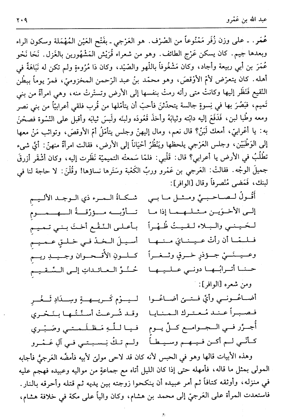عمر على وزن زفر مَمْنُوعًا من الصّرْف هُوَ العرجي بِفَتْح الْعين الْمُهْملَة وَسُكُون الرَّاء وبهدها جِيم كَانَ يسكن عرج الطَّائِف وَهُوَ من شعراء قُرَيْش الْمَشْهُورين بالغزل نحا نَحْو عمر بن أبي ربيعَة وأجاد وَكَانَ مشغوفاً باللهو وَالصَّيْد وَكَانَ ذَا مروءةٍ وَلم تكن لَهُ نباهةٌ فِي أَهله كَانَ يتَعَرَّض لأم الأوقص وَهُوَ مُحَمَّد بن عبد الرحمان المَخْزُومِي فَمر يَوْمًا بِبَطن النقيع فَنظر إِلَيْهَا وَكَانَت مَتى رَأَتْهُ رمت بِنَفسِهَا إِلَى الأَرْض وتسترت مِنْهُ وَهِي امرأةٌ من بني تَمِيم فَبَصر بهَا فِي نسوةٍ جالسة يتحدثن فَأحب أَن يَتَأَمَّلهَا من قرب فلقي أَعْرَابِيًا من بني نصر وَمَعَهُ وطبا لبن فَدفع إِلَيْهِ دَابَّته وثيابه وَأخذ قعوده ولبنه وَلبس ثِيَابه وَأَقْبل على النسْوَة فصحن بِهِ يَا أَعْرَابِي أَمَعَك لبنٌ قَالَ نعم وَمَال إلَيْهِنَّ وَجلسَ يتَأَمَّل أم الأوقص وتواثب من مَعهَا إِلَى الوطبين وَجلسَ العرجي يلحظها وَينظر أَحْيَانًا إِلَى الأَرْض فَقَالَت امرأةٌ مِنْهُنَّ أَي شَيْء تطلب فِي)