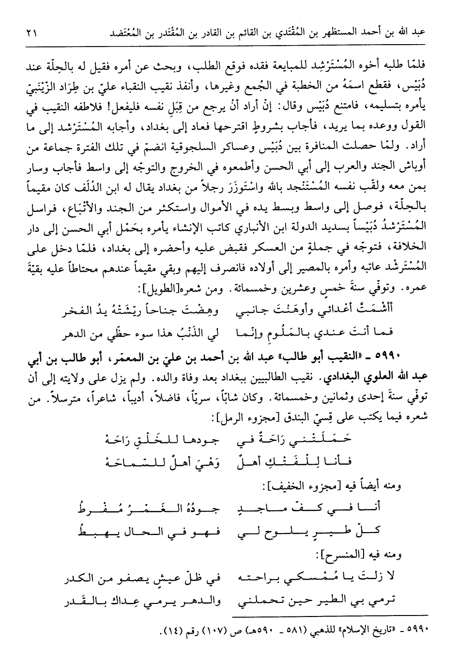 فَلَمَّا طلبه أَخُوهُ المسترشد للمبايعة فَقده فَوَقع الطّلب وَبحث عَن أمره فَقيل لَهُ بالحلة عِنْد دبيس فَقطع اسْمه من الْخطْبَة فِي الْجمع وَغَيرهَا وأنفذ نقيب النُّقَبَاء عَليّ بن طراد الزَّيْنَبِي يَأْمُرهُ بِتَسْلِيمِهِ فَامْتنعَ دبيس وَقَالَ إِن أَرَادَ أَن يرجع من قبل نَفسه فَلْيفْعَل فلاطفه النَّقِيب فِي القَوْل ووعده بِمَا يُرِيد فَأجَاب بشروطٍ اقترحها فَعَاد إِلَى بَغْدَاد وأجابه المسترشد إِلَى مَا أَرَادَ وَلما حصلت المنافرة بَين دبيس وعساكر السلجوقية انْضَمَّ فِي تِلْكَ الفترة جمَاعَة من أوباش الْجند وَالْعرب إِلَى أبي الْحسن وأطمعوه فِي الْخُرُوج والتوجه إِلَى وَاسِط فَأجَاب وَسَار بِمن مَعَه ولقب نَفسه المستنجد بِاللَّه)