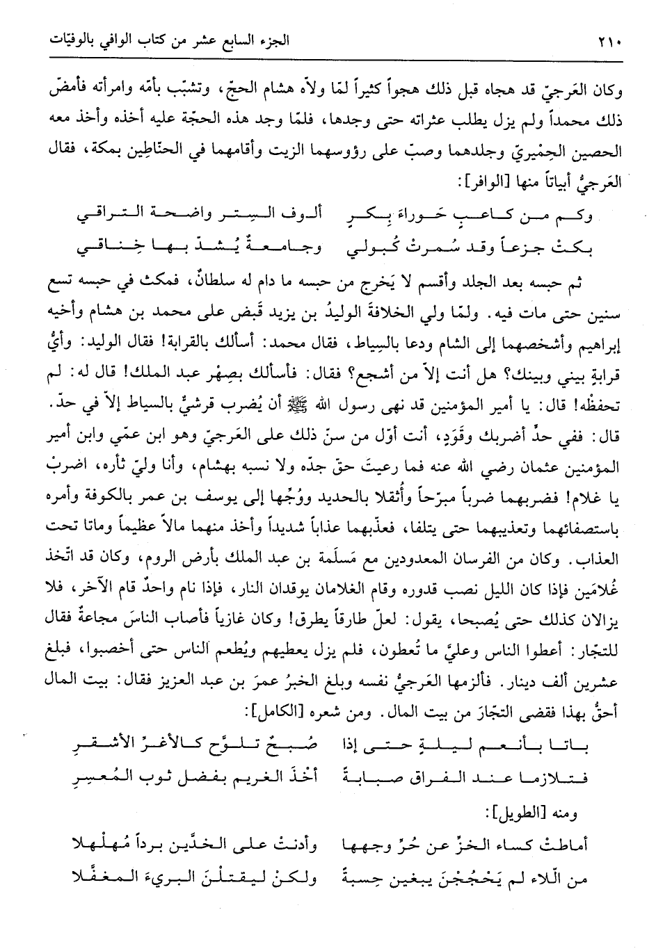 قَالَ فَفِي حدٍّ أضربك وقودٍ أَنْت أول من سنّ ذَلِك على العرجي وَهُوَ ابْن عمي وَابْن أَمِير الْمُؤمنِينَ عُثْمَان رَضِي الله عَنهُ فَمَا رعيت حق جده وَلَا نسبه بِهِشَام وَأَنا ولي ثَأْره إضراب يَا غُلَام فضربهما ضربا مبرحاً وأثقلا بالحديد ووجها إِلَى يُوسُف بن عمر بِالْكُوفَةِ وَأمره باستصفائهما وتعذيبهما حَتَّى يتلفا فعذبهما عذَابا شَدِيدا وَأخذ مِنْهُمَا مَالا عَظِيما وَمَاتَا تَحت الْعَذَاب وَكَانَ من الفرسان الْمَعْدُودين مَعَ مسلمة بن عبد الْملك بِأَرْض الرّوم وَكَانَ قد اتخذ غلامين فَإِذا كَانَ اللَّيْل نصب قدوره وَقَامَ الغلامان يوقدان النَّار فَإِذا نَام واحدٌ قَامَ الآخر فَلَا يزَالَانِ كَذَلِك حَتَّى يصبحا يَقُول لَعَلَّ طَارِقًا يطْرق وَكَانَ غازياً فَأصَاب النَّاس مجاعةٌ فَقَالَ للتجار أعْطوا النَّاس وَعلي مَا تعطون فَلم يزل يعطيهم وَيطْعم النَّاس حَتَّى أخصبوا فَبلغ عشْرين ألف دِينَار فألزمها العرجي نَفسه وَبلغ الْخَبَر عمر بن عبد الْعَزِيز فَقَالَ بَيت المَال أَحَق بِهَذَا فَقضى التُّجَّار من بَيت المَال وَمن شعره من الْكَامِل