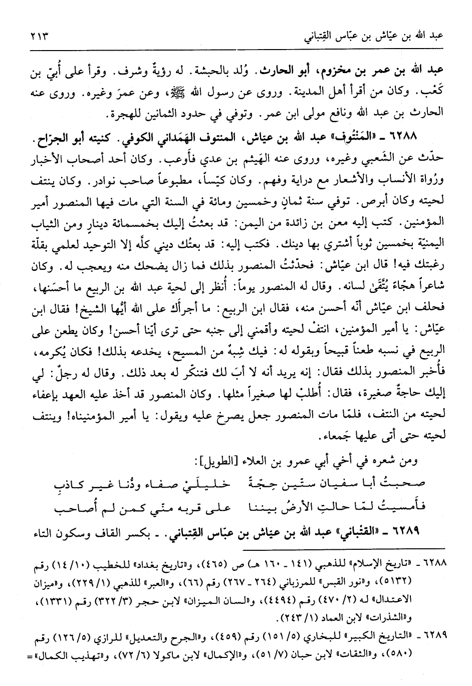 وروى عَنهُ الْهَيْثَم بن عدي فأوعب وَكَانَ أحد أَصْحَاب الْأَخْبَار ورواة الْأَنْسَاب والأشعار مَعَ دراية وَفهم وَكَانَ كيساً مطبوعاً صَاحب نَوَادِر كَانَ ينتف لحيته وَكَانَ أبرص توفّي سنة ثمانٍ وَخمسين وَمِائَة فِي السِّتَّة الَّتِي مَاتَ فِيهَا الْمَنْصُور أَمِير الْمُؤمنِينَ كتب إِلَيْهِ معن بن زَائِدَة من الْيمن قد بعثت إِلَيْك بِخَمْسِمِائَة دينارٍ وَمن الثِّيَاب اليمنية بِخَمْسِينَ ثوبا أَشْتَرِي بهَا دينك فَكتب إِلَيْهِ قد بِعْتُك ديني كُله إِلَّا التَّوْحِيد لعلمي بقلة رغبتك فِيهِ قَالَ ابْن عَيَّاش فَحدثت الْمَنْصُور بذلك فَمَا زَالَ يضْحك مِنْهُ ويعجب لَهُ وَكَانَ شَاعِرًا هجاء يتقى لِسَانه وَقَالَ لَهُ الْمَنْصُور يَوْمًا أنظر إِلَى لحية عبد الله بن الرّبيع مَا أحْسنهَا فَحلف ابْن عَيَّاش أَنه أحسن مِنْهُ فَقَالَ ابْن الرّبيع مَا أجرأك على الله أَيهَا الشَّيْخ فَقَالَ ابْن عَيَّاش يَا أَمِير الْمُؤمنِينَ إنتف لحيته وأقمني إِلَى جنبه حَتَّى ترى أَيّنَا أحسن وَكَانَ يطعن على الرّبيع فِي نسبه طَعنا قبيحاً وَيَقُول لَهُ فِيك شبهٌ من الْمَسِيح يخدعه بذلك فَكَانَ يُكرمهُ فَأخْبر الْمَنْصُور بذلك فَقَالَ إِنَّه يُرِيد أَنه لَا أَب لَك فتنكر لَهُ بعد ذَلِك وَقَالَ لَهُ رجلٌ لي إِلَيْك حاجةٌ صَغِيرَة فَقَالَ أطلب لَهَا صَغِيرا مثلهَا وَكَانَ الْمَنْصُور قد أَخذ عَلَيْهِ الْعَهْد بإعفاء لحيته من النتف فَلَمَّا مَاتَ الْمَنْصُور جعل يصْرخ عَلَيْهِ وَيَقُول يَا أَمِير المؤمنيناه وينتف لحيته حَتَّى أَتَى عَلَيْهَا جَمْعَاء)