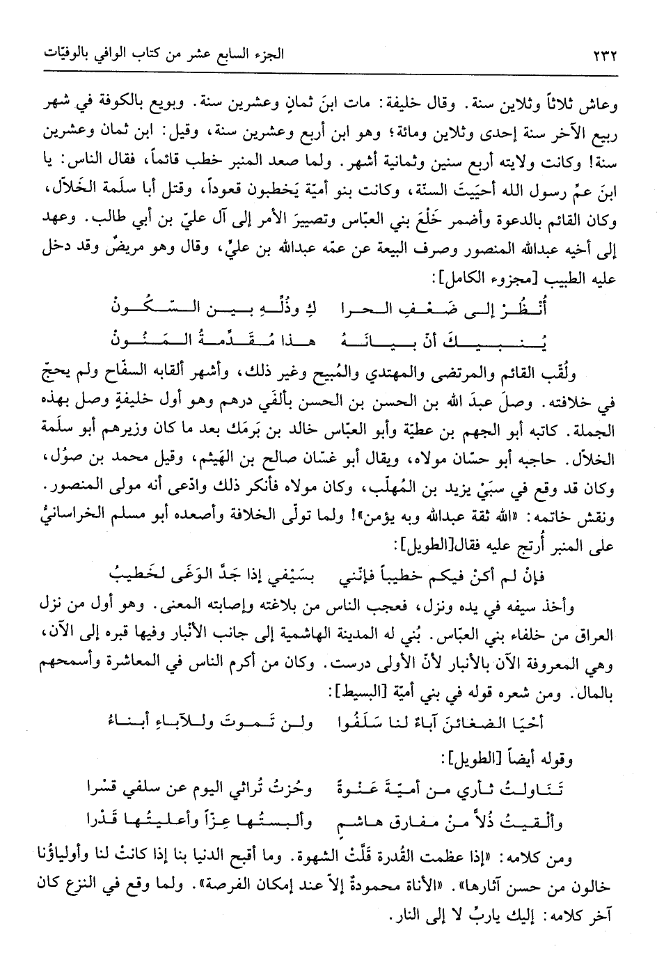 وَأخذ سَيْفه فِي يَده وَنزل فَعجب النَّاس من بلاغته وإصابته الْمَعْنى وَهُوَ أول من نزل الْعرَاق من خلفاء بني الْعَبَّاس بني لَهُ الْمَدِينَة الهاشمية إِلَى جَانب الأنبار وفيهَا قَبره إِلَى الْآن وَهِي الْمَعْرُوفَة الْآن بالأنبار لِأَن الأولى درست وَكَانَ من أكْرم النَّاس فِي المعاشرة وأسمحهم بِالْمَالِ وَمن شعره قَوْله فِي بني أُميَّة من الْبَسِيط