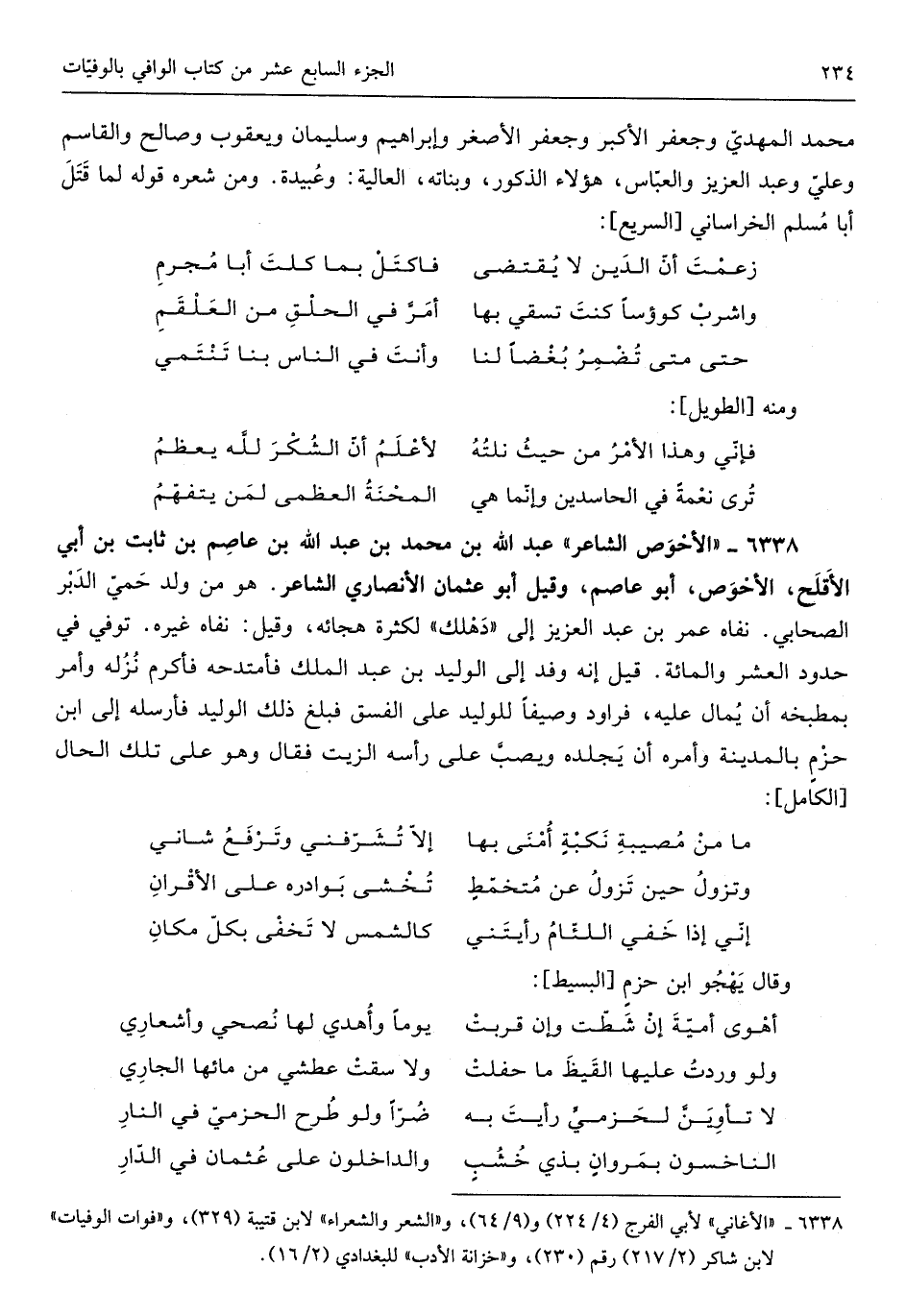 الْأَحْوَص الشَّاعِر عبد الله بن مُحَمَّد بن عبد الله بن عَاصِم بن ثَابت بن أبي الأقلح الْأَحْوَص أَبُو عَاصِم وَقيل أَبُو عُثْمَان الْأنْصَارِيّ الشَّاعِر هُوَ من ولد حمي الدبر الصَّحَابِيّ نَفَاهُ عمر بن عبد الْعَزِيز إِلَى دهلك لِكَثْرَة هجائه وَقيل نَفَاهُ غَيره توفّي فِي حُدُود الْعشْر وَالْمِائَة قيل إِنَّه وَفد إِلَى الْوَلِيد بن عبد الْملك فأمتدحه فَأكْرم نزله وَأمر بمطبخه أَن يمال عَلَيْهِ فراود وصيفاً للوليد على الْفسق فَبلغ ذَلِك الْوَلِيد فَأرْسلهُ إِلَى ابْن حزمٍ بِالْمَدِينَةِ وَأمره أَن يجلده وَيصب على رَأسه الزَّيْت فَقَالَ وَهُوَ على تِلْكَ الْحَال من الْكَامِل