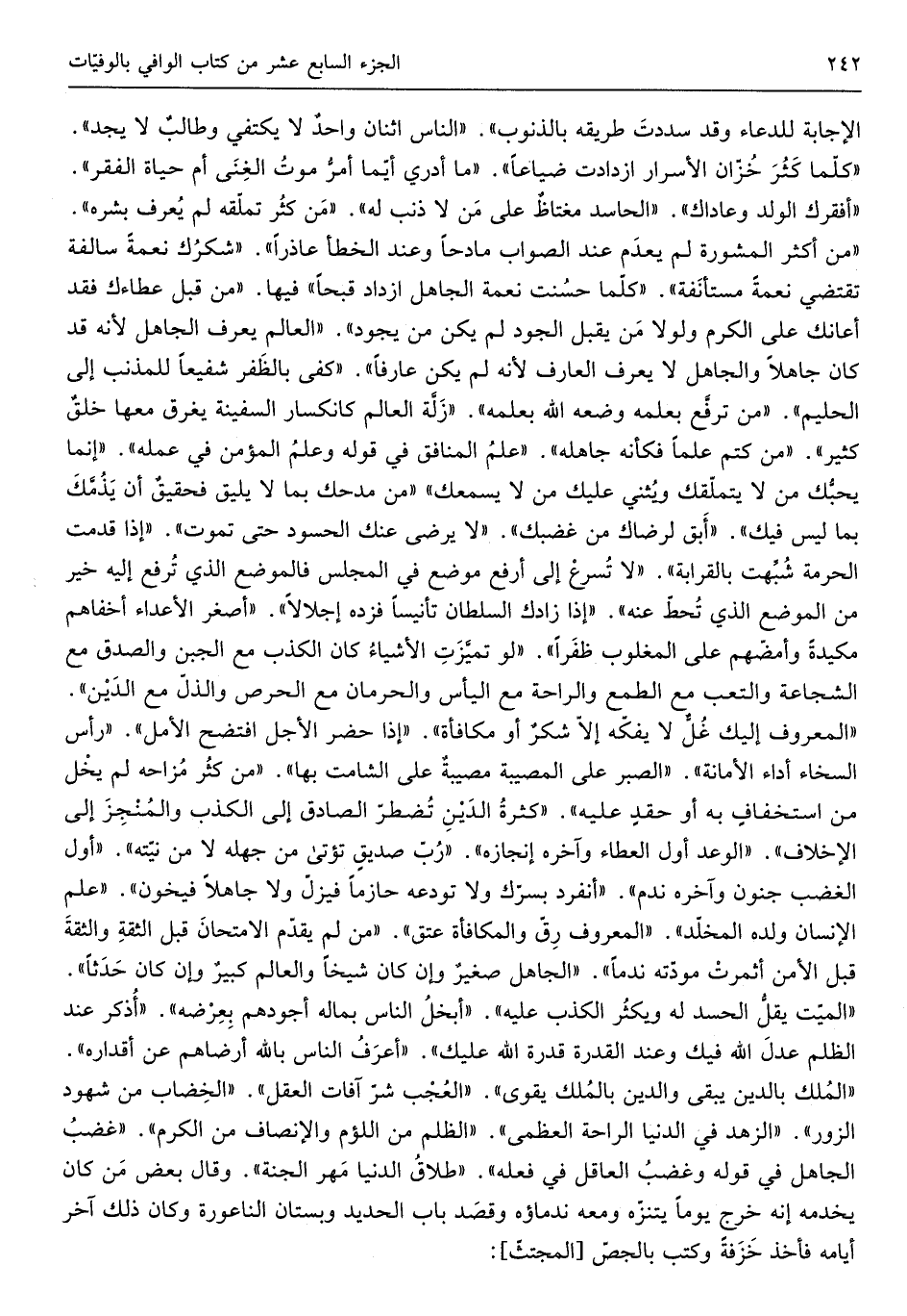 الْإِجَابَة للدُّعَاء وَقد سددت طَريقَة بِالذنُوبِ النَّاس اثْنَان واحدٌ لَا يَكْتَفِي وطالبٌ لَا يجد كلما كثر خزان الْأَسْرَار ازدادت ضيَاعًا مَا ادري أَيّمَا أَمر موت الْغنى أم حَيَاة الْفقر أفقرك الْوَالِد وعاداك الْحَاسِد مغتاظٌ على من لَا ذَنْب لَهُ من كثر تملقه لم يعرف بشره من أَكثر المشورة لم يعْدم عِنْد الصَّوَاب مادحاً وَعند الْخَطَأ عاذراً شكرك نعْمَة سالفة تَقْتَضِي نعْمَة مستأنفه كلما حسنت نعْمَة الْجَاهِل ازْدَادَ قبحاً فِيهَا من قبل عطاءك فقد أعانك على الْكَرم وَلَوْلَا من يقبل الْجُود لم يكن من يجود الْعَالم يعرف الْجَاهِل لِأَنَّهُ قد كَانَ جَاهِلا وَالْجَاهِل لَا يعرف الْعَارِف لِأَنَّهُ لم يكن عَارِفًا كفى بالظفر للمذنب إِلَى الْحَلِيم من ترفع بِعِلْمِهِ وَضعه الله بِعِلْمِهِ زلَّة الْعَالم كانكسار السَّفِينَة يغرق مَعهَا خلقٌ كثير من كتم علما فَكَأَنَّهُ جاهله علم الْمُنَافِق فِي قَوْله وَعلم الْمُؤمن فِي عمله إِنَّمَا يحبك من لَا يتملقك ويثني عَلَيْك من لَا يسمعك من مدحك بِمَا لَا يَلِيق فحقيق أَن يذمك بِمَا لَيْسَ فِيك أبق لرضاك من غضبك لَا يرضى عَنْك الحسود حَتَّى تَمُوت إِذا قدمت الرَّحْمَة شبهت بِالْقَرَابَةِ لَا تسرع إِلَى أرفع مَوضِع فِي الْمجْلس فالموضع الَّذِي ترفع إِلَيْهِ خير من الْموضع الَّذِي تحط عَنهُ