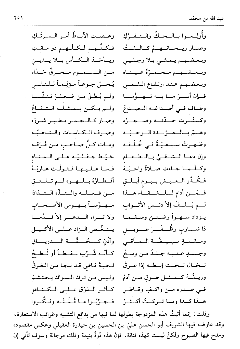 قلت إِنَّمَا أثبت هَذِه المزدوجة بِطُولِهَا لما فِيهَا من بَدَائِع التَّشْبِيه وغرائب الِاسْتِعَارَة وَقد عَارضه فِيهَا الشريف أَبُو الْحسن عَليّ بن الْحُسَيْن بن حيدرة الْعقيلِيّ وَعكس مَقْصُوده ومدح فِيهَا الصبوح وَلَكِن لَيست كهذه فتانة فَإِن هَذِه درةٌ يتيمة وَتلك مرْجَانَة وسوف تَأتي إِن