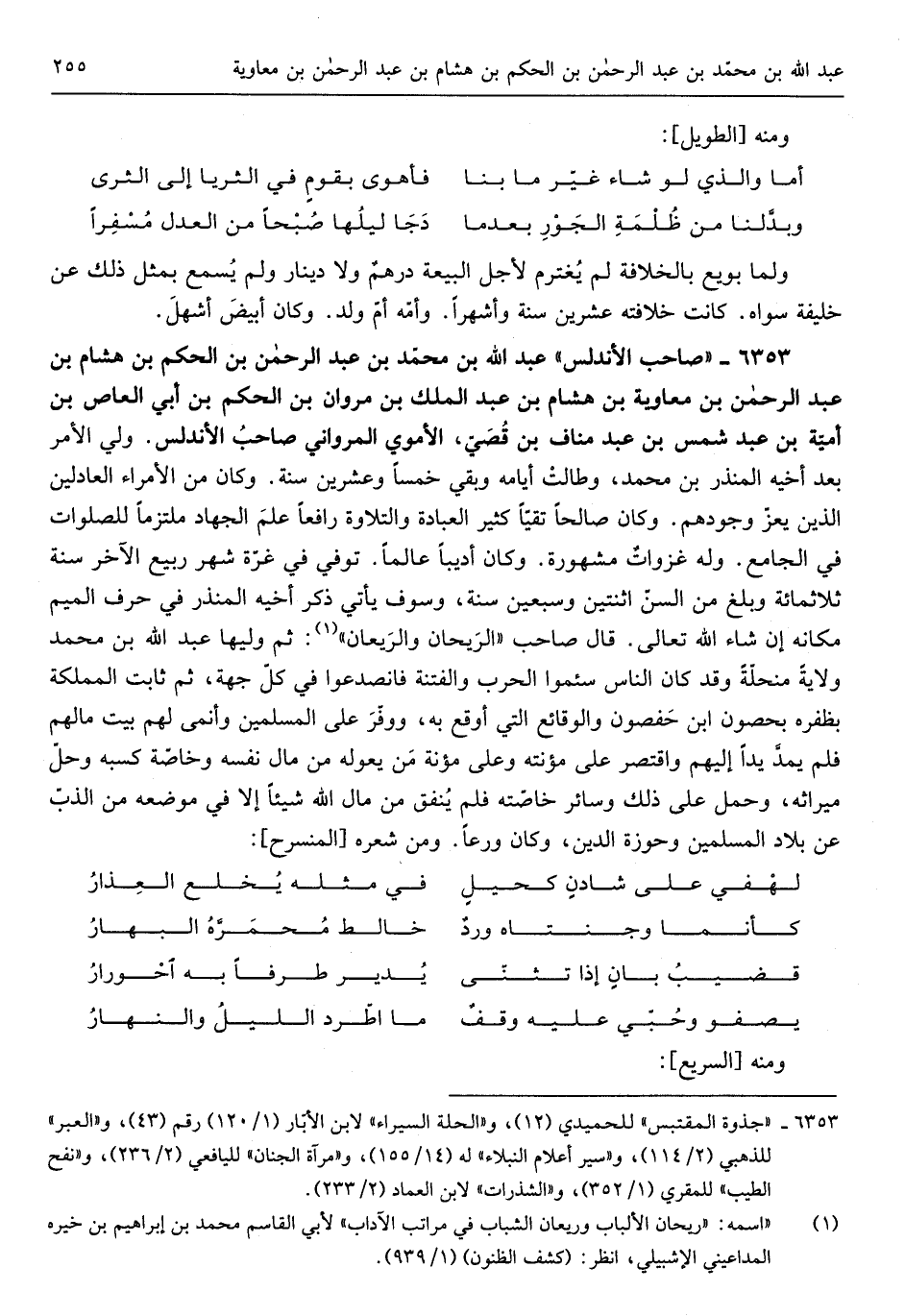صَاحب الأندلس عبد الله بن مُحَمَّد بن عبد الرحمان الحكم بن هِشَام بن عبد الرحمان ابْن مُعَاوِيَة بن هِشَام بن عبد الْملك بن مَرْوَان بن الحكم بن أبي الْعَاصِ بن أُميَّة عبد شمس بن عبد منَاف بن قصي الْأمَوِي المرواني صَاحب الأندلس ولي الْأَمر بعد أَخِيه الْمُنْذر بن مُحَمَّد وطالت أَيَّامه وَبَقِي خمْسا وَعشْرين سنة وَكَانَ من الْأُمَرَاء العادلين الَّذين يعز وجودهم وَكَانَ صَالحا تقياً كثير الْعِبَادَة والتلاوة رَافعا علم الْجِهَاد مُلْتَزما للصلوات فِي الْجَامِع وَله غزوات مَشْهُورَة وَكَانَ أديباً عَالما توفّي فِي غرَّة شهر ربيع الآخر سنة ثَلَاثمِائَة وَبلغ من السن اثْنَتَيْنِ وَسبعين سنة وسوف يَأْتِي ذكر أَخِيه الْمُنْذر فِي حرف الْمِيم مَكَانَهُ إِن شَاءَ الله تَعَالَى قَالَ صَاحب الريحان والريعان ثمَّ وَليهَا عبد الله بن مُحَمَّد ولَايَة منحلةً وَقد كَانَ النَّاس سئموا الْحَرْب والفتنة فانصدعوا فِي كل جِهَة ثمَّ ثَابت المملكة بظفره بحصون ابْن حفصون والوقايع الَّتِي أوقع بِهِ ووفر على الْمُسلمين وأنمى لَهُم بَيت مَالهم فَلم يمد يدا إِلَيْهِم وَاقْتصر على مُؤْنَته وعَلى مُؤنَة من يعوله من مَال نَفسه وخاصة كَسبه وَحل مِيرَاثه وَحمل على ذَلِك وَلَده وَسَائِر خاصته فَلم ينْفق من مَال الله شَيْئا إِلَّا فِي مَوْضِعه من الذب عَن بِلَاد الْمُسلمين وحوزة الدّين وَكَانَ روعاً