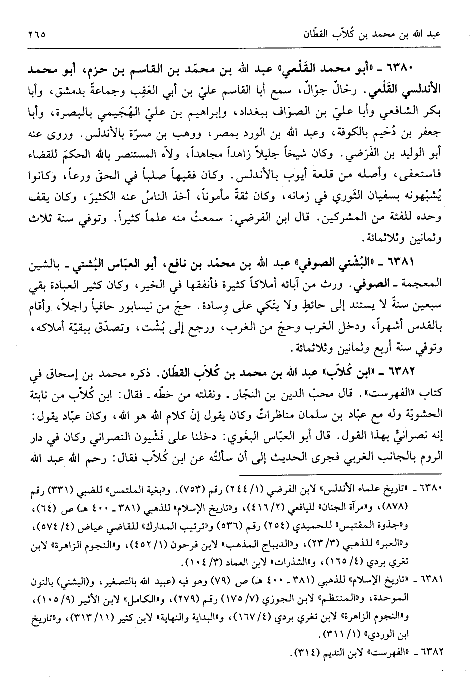 أَبُو مُحَمَّد القلعي عبد الله بن مُحَمَّد بن الْقَاسِم بن حزم أَبُو مُحَمَّد الأندلسي القلعي رحالٌ جوالٌ سمع أَبَا الْقَاسِم عَليّ بن أبي الْعقب وَجَمَاعَة بِدِمَشْق وَأَبا بكر الشَّافِعِي وَأَبا عَليّ بن الصَّواف بِبَغْدَاد وَإِبْرَاهِيم بن عَليّ الهُجَيْمِي بِالْبَصْرَةِ وَأَبا جَعْفَر بن دُحَيْم بِالْكُوفَةِ وَعبد الله بن الْورْد بِمصْر ووهب بن مَسَرَّة بالأندلس وروى عَنهُ أَبُو الْوَلِيد بن الفرضي وَكَانَ شَيخا جَلِيلًا زاهداً شجاعاً مُجَاهدًا ولاه الْمُسْتَنْصر بِاللَّه الحكم للْقَضَاء فاستعفى وَأَصله من قلعة أَيُّوب بالأندلس وَكَانَ فَقِيها صلباً الْحق ورعاً وَكَانُوا يشبهونه بسفيان الثَّوْريّ فِي زَمَانه وَكَانَ ثِقَة مَأْمُونا أَخذ النَّاس عَنهُ الْكثير وَكَانَ يقف وَحده للفئة من الْمُشْركين قَالَ ابْن الفرضي سَمِعت مِنْهُ علما كثيرا وَتُوفِّي سنة ثَلَاث وَثَمَانِينَ وثلاثمائة