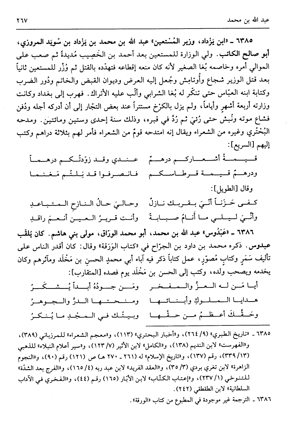 عَبدُوس عبد الله بن مُحَمَّد أَبُو مُحَمَّد الْوراق مولى بني هَاشم كَانَ يلقب عَبدُوس ذكره مُحَمَّد بن دَاوُد بن الْجراح فِي كتاب الورقة وَقَالَ كَانَ أقدر النَّاس على تأليف سمرٍ وكتابٍ مصورٍ عمل كتابا ذكر فِي آبَاء أبي مُحَمَّد الْحسن بن مخلد ومآثرهم وَكَانَ يَخْدمه ويصحب وَلَده وَكتب إِلَى الْحسن بن مخلد يَوْم فصده من المتقارب