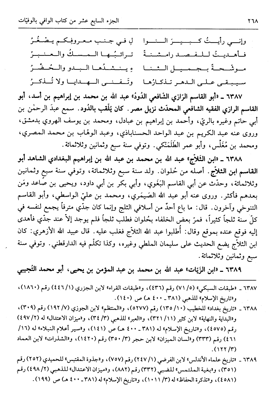 ابْن الثلاج عبد الله بن مُحَمَّد بن عبد الله بن إِبْرَاهِيم الْبَغْدَادِيّ الشَّاهِد أَبُو الْقَاسِم ابْن الثلاج أَصله من حلوان ولد سنة سبعٍ وثلاثمائة وَتُوفِّي سنة سبعٍ وَثَمَانِينَ وثلاثمائة وَحدث عَن أبي الْقَاسِم الْبَغَوِيّ وَأبي بكر بن أبي دَاوُد وَيحيى بن صاعد وَمن بعدهمْ فَأكْثر وروى عَنهُ أَبُو عبد الله الصَّيْمَرِيّ وَمُحَمّد بن عَليّ الوَاسِطِيّ وَأَبُو الْقَاسِم التنوخي وَآخَرُونَ قَالَ مَا بَاعَ أحدٌ من أسلافي الثَّلج إِنَّمَا كَانَ جدي مترفاً يجمع لنَفسِهِ كل فِي سنة ثلجاً كثيرا فَمر بعض الْخُلَفَاء بحلوان فَطلب ثلجاً فَلم يُوجد إِلَّا عِنْد جدي فأهدى إِلَيْهِ فَوَقع عِنْده بموقع وَقَالَ اطْلُبُوا عبد الله الثلاج فغلب عَلَيْهِ قَالَ عبيد الله الازهري كَانَ ابْن الثلاج الحَدِيث على سُلَيْمَان المطلي وَغَيره وَكَذَا تكلم فِيهِ الدَّارَقُطْنِيّ وَتُوفِّي سنة سبع وَثَمَانِينَ وثلاثمائة