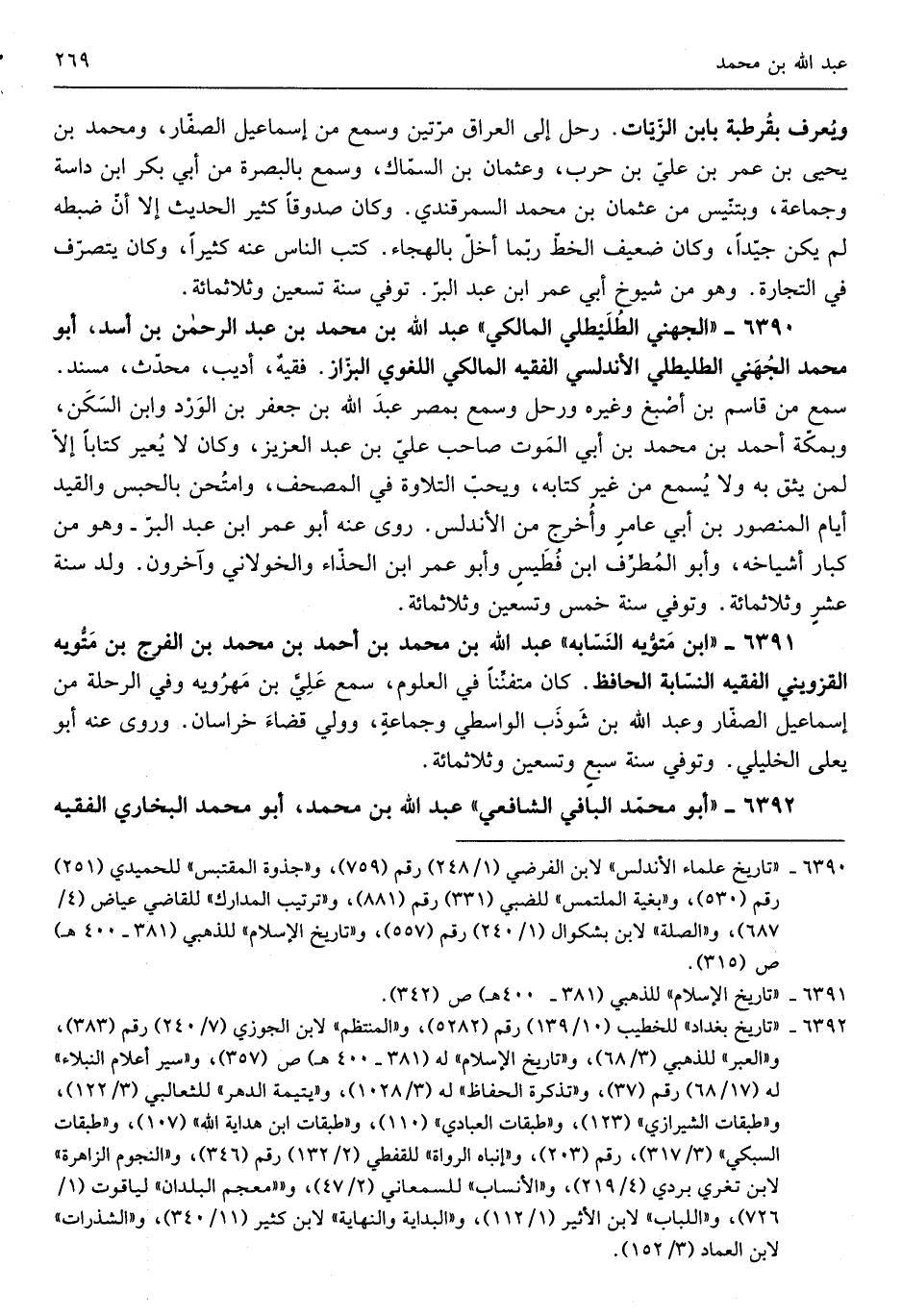 الْجُهَنِيّ الطليطلي الْمَالِكِي عبد الله بن مُحَمَّد بن عبد الرحمان بن أَسد أَبُو مُحَمَّد الْجُهَنِيّ الطليطلي الأندلسي الْفَقِيه الْمَالِكِي اللّغَوِيّ الْبَزَّاز فقيهٌ أديب مُحدث مُسْند سمع من قَاسم بن أصبغ وَغَيره ورحل وَسمع بِمصْر عبد الله بن جَعْفَر بن الْورْد وَابْن السكن وبمكة أَحْمد بن مُحَمَّد بن أبي الْمَوْت صَاحب عَليّ ابْن عبد الْعَزِيز كَانَ لَا يعير كتابا إِلَّا لمن يَثِق بِهِ وَلَا يسمع من غير كِتَابه وَيُحب التِّلَاوَة فِي الْمُصحف وامتحن الْحَبْس والقيد أَيَّام الْمَنْصُور بن أبي عامرٍ أخرج من الأندلس ورى عَنهُ أَبُو عمر ابْن عبد الْبر وَهُوَ من كبار أشياخه وَأَبُو الْمطرف ابْن فطيسٍ وَأَبُو عمر ابْن الْحذاء والخولاني وَآخَرُونَ ولد سنة عشرٍ وثلاثمائة وَتُوفِّي سنة خمسٍ وَتِسْعين وثلاثمائة