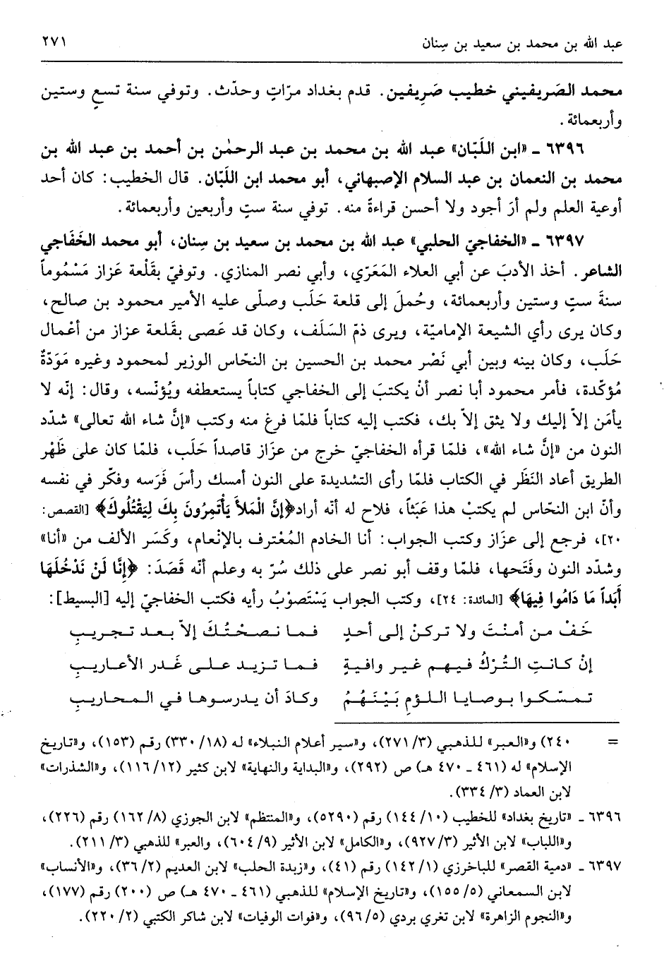 الخفاجي الْحلَبِي عبد الله بن مُحَمَّد بن سعيد بن سِنَان أَبُو مُحَمَّد الْحلَبِي الخفاجي الشَّاعِر أَخذ الْأَدَب عَن أبي الْعَلَاء المعري وَأبي نصر المنازي وَتُوفِّي بقلعة عزاز مسموماً سنة سِتّ وَسِتِّينَ وَأَرْبَعمِائَة وَحمل إِلَى قلعة حلب وَصلى عَلَيْهِ الْأَمِير مَحْمُود بن صَالح وَكَانَ يرى رَأْي الشِّيعَة الإمامية وَيرى ذمّ السّلف وَكَانَ قد عصى بقلعة عزاز من أَعمال حلب وَكَانَ بَينه وَبَين أبي نصر)