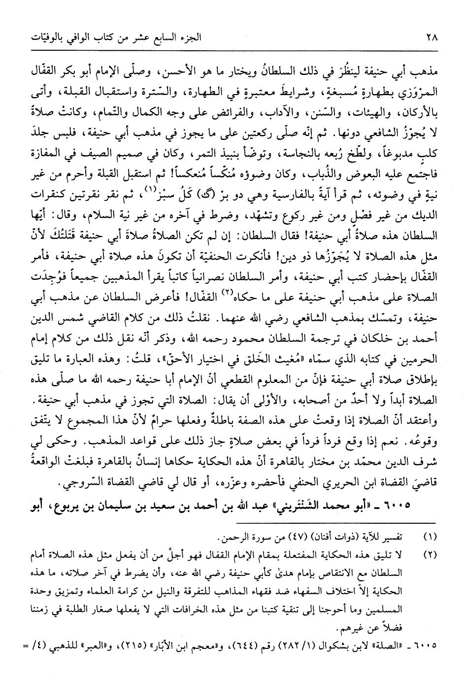 مَذْهَب أبي حنيفَة لينْظر فِي ذَلِك السُّلْطَان ويختار مَا هُوَ الْأَحْسَن وَصلى الإِمَام أَبُو بكر الْقفال الْمروزِي بطهارةٍ مُسبغةٍ وشرايط معتبرةٍ فِي الطَّهَارَة والسترة واستقبال الْقبْلَة وأتى بالأركان والهيئات وَالسّنَن والآداب والفرائض على وَجه الْكَمَال والتمام وَكَانَت صَلَاة لَا يُجوز الشَّافِعِي دونهَا ثمَّ إِنَّه صلى رَكْعَتَيْنِ على مَا يجوز فِي مَذْهَب أبي حنيفَة فَلبس جلد كلبٍ مدبوغاً ولطخ ربعه بِالنَّجَاسَةِ وَتَوَضَّأ بنبيذ التَّمْر وَكَانَ فِي صميم الصَّيف فِي الْمَفَازَة فَاجْتمع عَلَيْهِ البعوض والذباب وَكَانَ وضوؤه مُنكساً منعكساً ثمَّ اسْتقْبل الْقبْلَة وَأحرم من غير نيةٍ فِي وضوئِهِ ثمَّ قَرَأَ آيَة بِالْفَارِسِيَّةِ وَهُوَ دوبر كَ كَلُ سبز ثمَّ نقر نقرتين كنقرات الديك عَن غير فصلٍ وَمن غير رُكُوع وَتشهد وضرط فِي آخِره من غير نِيَّة السَّلَام وَقَالَ أَيهَا السُّلْطَان هَذِه صَلَاة أبي حنيفَة فَقَالَ السُّلْطَان إِن لم تكن الصَّلَاة صَلَاة أبي حنيفَة قتلتك لِأَن مثل هَذِه الصَّلَاة لَا يجوزها ذُو دين فأنكرت الْحَنَفِيَّة أَن تكون هَذِه صَلَاة أبي حنيفَة فَأمر الْقفال بإحضار كتب أبي حنيفَة وَأمر السُّلْطَان نَصْرَانِيّا كَاتبا يقْرَأ المذهبين جَمِيعًا فَوجدت الصَّلَاة على مَذْهَب أبي حنيفَة على مَا حَكَاهُ القفّال فَأَعْرض السُّلْطَان عَن مَذْهَب أبي حنيفَة وَتمسك بِمذهب الشَّافِعِي رَضِي الله عَنْهُمَا نقلت ذَلِك من كَلَام القَاضِي شمس الدّين أَحْمد بن خلكان فِي تَرْجَمَة السُّلْطَان مَحْمُود رَحمَه الله وَذكر أَنه نقل ذَلِك من كَلَام إِمَام الْحَرَمَيْنِ فِي كِتَابه الَّذِي سَمَّاهُ مغيث الْخلق فِي اخْتِيَار الأحق قلت وَهَذِه الْعبارَة مَا تلِيق بِإِطْلَاق صَلَاة أبي حنيفَة فَإِن من الْمَعْلُوم الْقطعِي أنّ الإِمَام أَبَا حنيفَة رَحمَه الله مَا صلى هَذِه الصَّلَاة أبدأ وَلَا أحدا من أَصْحَابه وَالْأولَى أَن يُقَال الصَّلَاة الَّتِي تجوز فِي مَذْهَب أبي حنيفَة وأعتقد أَن الصَّلَاة إِذا وَقعت على هَذِه الصّفة باطلةٌ وفعلها حرامٌ لِأَن هَذَا الْمَجْمُوع لَا يتَّفق وُقُوعه نعم إِذا وَقع فَردا فَردا فِي بعض صَلَاة جَازَ ذَلِك على قَوَاعِد الْمَذْهَب وَحكى لي شرف الدّين مُحَمَّد بن مُخْتَار بِالْقَاهِرَةِ أَن هَذِه الْحِكَايَة حَكَاهَا إنسانٌ بِالْقَاهِرَةِ فبلغت الْوَاقِعَة)