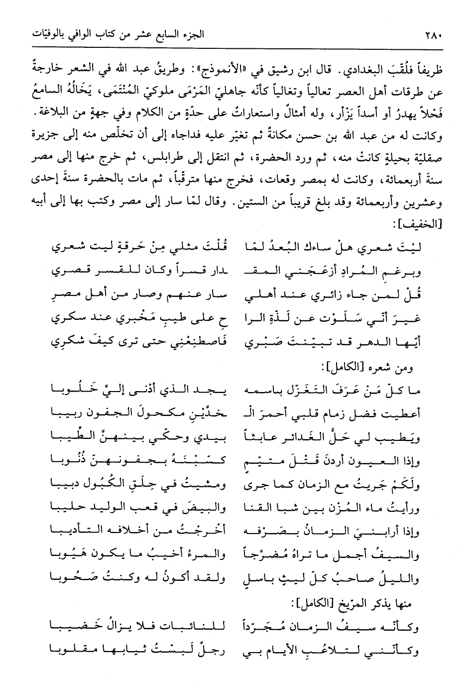 ظريفاً فلقب الْبَغْدَادِيّ قَالَ ابْن رَشِيق فِي الأنموذج وَطَرِيق عبد الله فِي الشّعْر خارجةٌ عَن طرقات أهل الْعَصْر تعالياً وتغالياً كَأَنَّهُ جاهلي المرمى ملوكي المنتمى يخاله السَّامع فحلاً يهدر أَو أسداً يزأر وَله أمثالٌ واستعاراتٌ على حدةٍ من الْكَلَام وَفِي جهةٍ من البلاغة وَكَانَت لَهُ من عبد الله بن حسن مكانةٌ ثمَّ تغير عَلَيْهِ فداجاه إِلَى أَن تخلص مِنْهُ إِلَى جَزِيرَة صقلية بحيلةٍ كَانَت مِنْهُ ثمَّ ورد الحضرة ثمَّ انْتقل إِلَى طرابلس ثمَّ خرج مِنْهَا إِلَى مصر سنة أَرْبَعمِائَة وَكَانَت لَهُ بِمصْر وقعات فَخرج مِنْهَا مترقباً ثمَّ مَاتَ بالحضرة سنة إِحْدَى وَعشْرين وَأَرْبَعمِائَة وَقد بلغ قَرِيبا من السِّتين وَقَالَ لما سَار إِلَى مصر وَكتب بهَا إِلَى أَبِيه من الْخَفِيف
