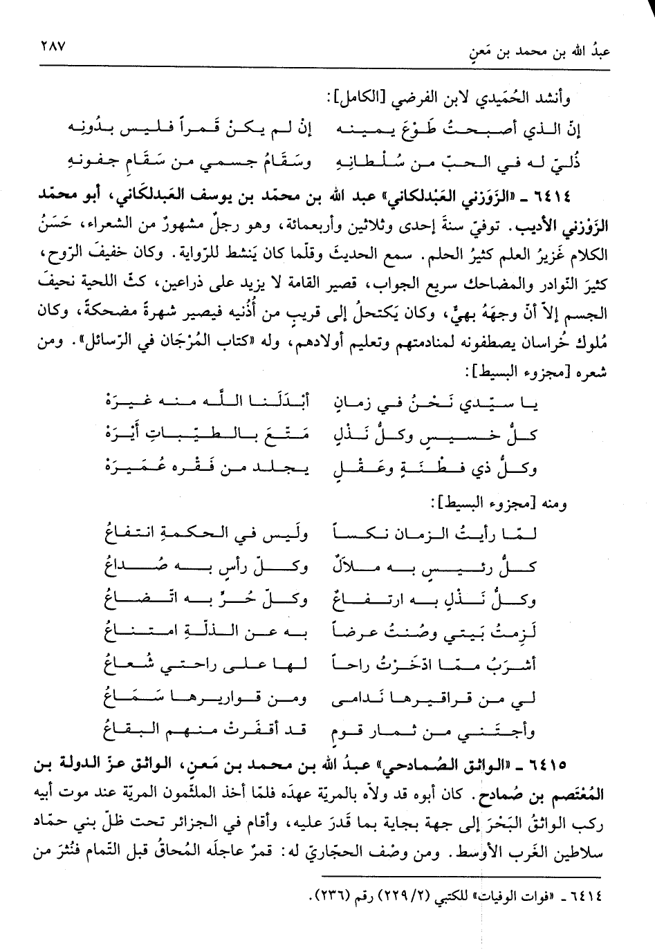 الواثق الصُّمادحي عبد الله بن مُحَمَّد بن معنٍ الواثق عز الدولة بن المعتصم بن صمادح كَانَ أَبوهُ قد ولاه بالمرية عَهده فَلَمَّا أَخذ الملثمون المرية عِنْد موت أَبِيه ركب الواثق الْبَحْر إِلى جِهَة بجاية بِمَا قدر عَلَيْهِ وَأقَام فِي الجزائر تَحت ظلّ بني حَمَّاد سلاطين الغرب الْأَوْسَط وَمن وصف الْحِجَازِي لَهُ قمرٌ عاجله المحاق قبل التَّمام فنشر من