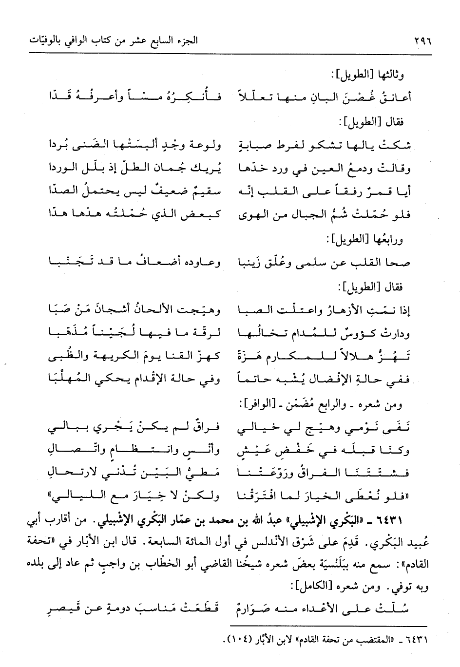 الْبكْرِيّ الإشبيلي عبد الله بن مُحَمَّد بن عمار الْبكْرِيّ الإشبيلي من أقَارِب أبي عبيد الْبكْرِيّ قدم على شَرق الأندلس فِي أول الْمِائَة السَّابِعَة قَالَ ابْن الْأَبَّار فِي تحفة القادم سمع مِنْهُ ببلنسية بعض شعره شَيخنَا القَاضِي أَبُو الْخطاب بن واجبٍ ثمَّ عَاد إِلَى بَلَده وَبِه توفّي وَمن شعره من الْكَامِل