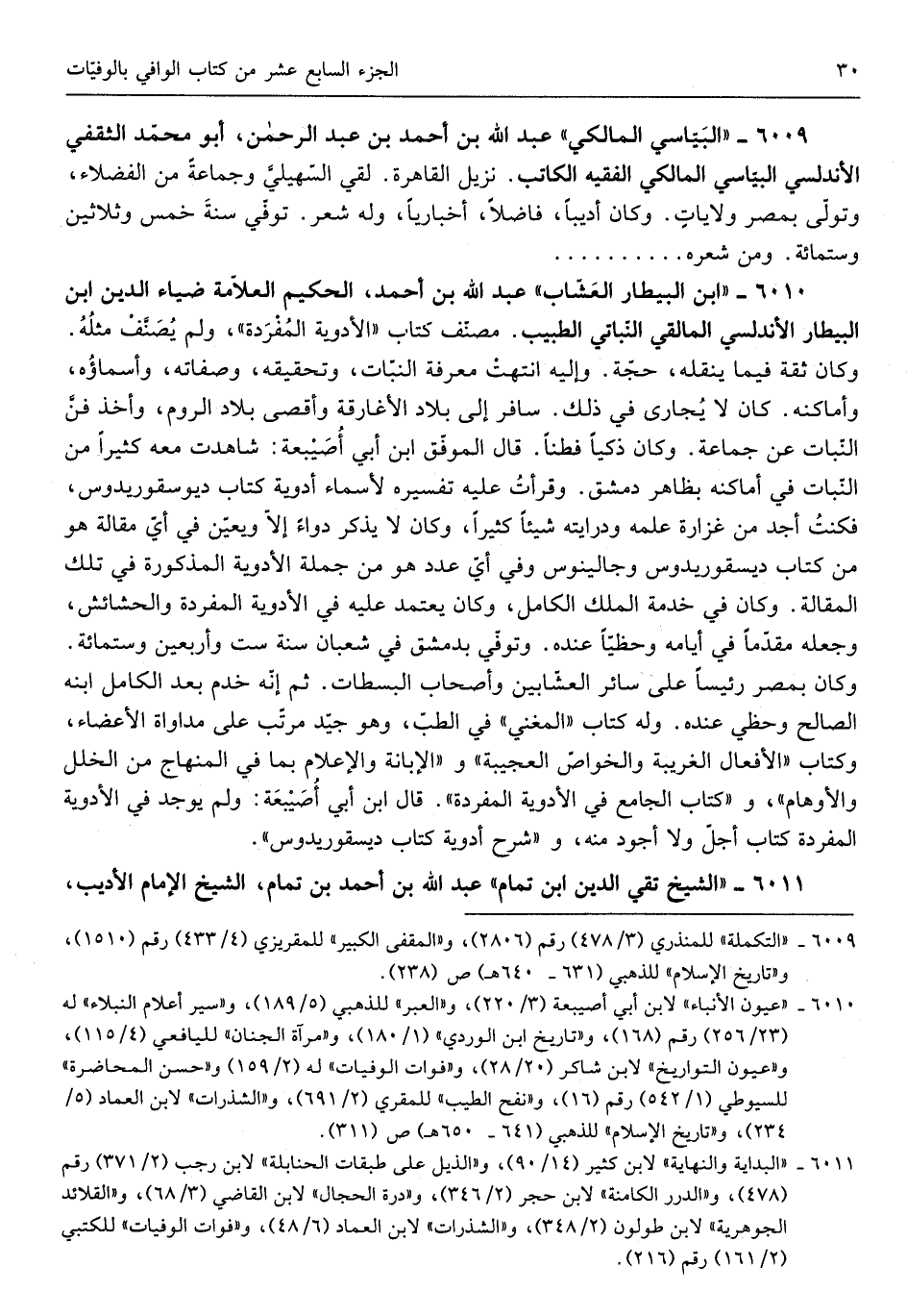 ابْن البيطار العشاب عبد الله بن أَحْمد الْحَكِيم الْعَلامَة ضِيَاء الدّين ابْن البيطار الأندلسي المالقي النباتي الطَّبِيب مُصَنف كتاب الْأَدْوِيَة المفردة وَلم يصنف مثله وَكَانَ ثِقَة فِيمَا يَنْقُلهُ حجَّة وَإِلَيْهِ أنتهت معرفَة النَّبَات وتحقيقه وَصِفَاته وأسماءه وأماكنه كَانَ لَا يجارى فِي ذَلِك سَافر إِلَى بِلَاد الأغارقة وأقصى بِلَاد الرّوم وَأخذ فن النَّبَات عَن جمَاعَة وَكَانَ ذكياً فطناً قَالَ الْمُوفق ابْن أبي أصيبعة شاهدت مَعَه كثيرا من النَّبَات فِي أماكنه بِظَاهِر دمشق وقرأت عَلَيْهِ تَفْسِيره لأسماء أدوية كتاب ديوسقوريدوس فَكنت أجد من غزارة علمه ودرايته شَيْئا كثيرا وَكَانَ لَا يذكر دَوَاء إِلَّا ويعين فِي أَي مقَالَة هُوَ من كتاب ديسقوريدوس وجالينوس وَفِي أَي عدد هُوَ من جملَة الْأَدْوِيَة الْمَذْكُورَة فِي تِلْكَ الْمقَالة وَكَانَ فِي خدمَة الْملك الْكَامِل وَكَانَ يعْتَمد عَلَيْهِ فِي الْأَدْوِيَة المفردة والحشائش وَجعله مقدما فِي أَيَّامه وحظياً عِنْده وَتُوفِّي بِدِمَشْق فِي شعْبَان سنة سِتّ وَأَرْبَعين وسِتمِائَة وَكَانَ بِمصْر رَئِيسا على سَائِر العشابين وَأَصْحَاب البسطات ثمَّ إِنَّه خدم بعد الْكَامِل ابْنه الصَّالح وحظي عِنْده وَله كتاب الْمُغنِي فِي الطِّبّ وَهُوَ جيد مُرَتّب على مداواة الْأَعْضَاء وَكتاب الْأَفْعَال الغريبة والخواص العجيبة والإبانة والإعلام بِمَا فِي الْمِنْهَاج من الْخلَل والأوهام وَكتاب الْجَامِع فِي الْأَدْوِيَة المفردة قَالَ ابْن أبي أصيبعة وَلم يُوجد فِي الْأَدْوِيَة المفردة كتاب أجل وَلَا أَجود مِنْهُ وَشرح أدوية كتاب ديسقوريدوس