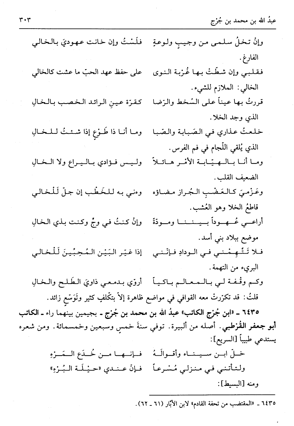 ابْن جرج الْكَاتِب عبد الله بن مُحَمَّد بن جرج بجيمين بَينهمَا رَاء الْكَاتِب أَبُو جَعْفَر الْقُرْطُبِيّ أَصله من ألبيرة توفّي سنة خمسٍ وَسبعين وَخَمْسمِائة وَمن شعره يَسْتَدْعِي طَبِيبا من السَّرِيع