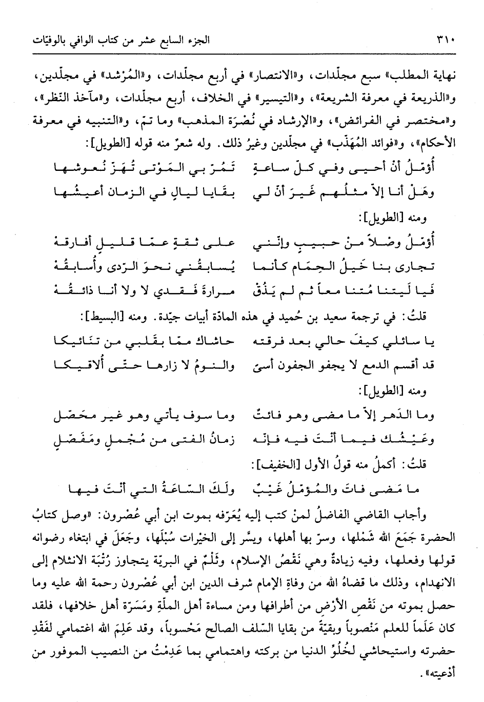 وَأجَاب القَاضِي الْفَاضِل لمن كتب إِلَيْهِ يعرفهُ بِمَوْت ابْن أبي عصرون وصل كتاب الْحَضَر جمع الله شملها وسر بهَا أَهلهَا وَيسر إِلَى الْخيرَات سبلها وَجعل فِي ابْتِغَاء رضوانه قَوْلهَا وفعلها وَفِيه زيادةٌ وَهِي نقص الْإِسْلَام وثلمٌ فِي الْبَريَّة يتَجَاوَز رُتْبَة الانثلام إِلَى الانهدام وَذَلِكَ مَا قَضَاهُ الله من وَفَاة الإِمَام شرف الدّين ابْن أبي عصرون رَحْمَة الله عَلَيْهِ وَمَا حصل بِمَوْتِهِ من نقص الأَرْض من أطرافها وَمن مساءة أهل الْملَّة ومسرة أهل خلَافهَا فَلَقَد كَانَ علما للْعلم مَنْصُوبًا وَبَقِيَّة من بقايا السّلف الصَّالح محسوباً وَقد علم الله اغتمامي لفقد حَضرته واستيحاشي لخلو الدُّنْيَا من بركته واهتمامي بِمَا عدمت من النَّصِيب الموفور من أدعيته)