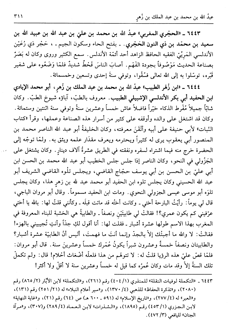 ابْن زهر الطَّبِيب عبد الله بن مُحَمَّد بن عبد الْملك بن زهرٍ أَبُو مُحَمَّد الْإِيَادِي ابْن الْحَفِيد أبي بكر الأندلسي الإشبيلي الطَّبِيب مَعْرُوف بالطب آباؤه شُيُوخ لطب وَكَانَ شَابًّا جميلاً مفرط الذكاء خيرا عَاشَ خمْسا وَعشْرين سنة وَتُوفِّي سنة اثْنَتَيْنِ وسِتمِائَة وَكَانَ قد اشْتغل على وَالِده وَأَوْقفهُ على كثيرٍ من أسرار هَذِه الصِّنَاعَة وعملها وَقَرَأَ كتاب النَّبَات لأبي حنيفَة على أَبِيه وأتقن مَعْرفَته وَكَانَ الْخَلِيفَة أَبُو عبد الله النَّاصِر مُحَمَّد بن الْمَنْصُور أبي يَعْقُوب يرى لَهُ كثيرا ويحترمه وَيعرف مِقْدَار علمه ويثق بِهِ وَلما توجه إِلَى الحضرة خرج مِنْهُ فِيمَا اشْتَرَاهُ لسفره وَنَفَقَته فِي الطَّرِيق عشرَة آلَاف دينارٍ وَكَانَ يشْتَغل على الْجُزُولِيّ فِي النَّحْو وَكَانَ النَّاصِر إِذا جلس جلس الْخَطِيب أَبُو عبد الله بن مُحَمَّد بن الْحسن بن أبي عَليّ بن الْحسن بن أبي يُوسُف حجاج القَاضِي وَيجْلس تلوه القَاضِي الشريف أَبُو عبد الله الْحُسَيْنِي وَكَانَ يجلس تلوه ابْن الْحَفِيد أَبُو مُحَمَّد عبد الله بن زهرٍ هَذَا وَكَانَ يجلس تلوه أَبُو مُوسَى عِيسَى الْجُزُولِيّ النَّحْوِيّ وَمَات ابْن الْحَفِيد مسموماً وَقَالَ أَبُو مَرْوَان الْبَاجِيّ قَالَ لي يَوْمًا رَأَيْت البارحة أُخْتِي وَكَانَت أُخْته قد مَاتَت قبله وكأنني قلت لَهَا بِاللَّه يَا أُخْتِي عرفيني كم يكون عمري فَقَالَت لي طابيتين وَنصفا والطابية هِيَ الْخَشَبَة للْبِنَاء الْمَعْرُوفَة فِي الْمغرب بِهَذَا الِاسْم طولهَا عشرَة أشبار فَقلت لَهَا أَنا أَقُول لَك جدا وَأَنت تجيبيني بالهزء فَقَالَت لَا وَالله مَا أَجَبْتُك إِلَّا بالجد وَإِنَّمَا أَنْت مَا فهمت أَلَيْسَ أَن الطابية عشرَة أشبار والطابيتان وَنصفا خمسةٌ وَعِشْرُونَ شبْرًا يكون عمرك خمْسا وَعشْرين سنة قَالَ أَبُو مَرْوَان فَلَمَّا قصّ عَليّ هَذِه الرُّؤْيَا قلت لَهُ لَا تتوهم من هَذَا فَلَعَلَّهُ أضغاث أَحْلَام قَالَ وَلَا تكمل تِلْكَ السّنة إِلَّا وَقد مَاتَ وَكَانَ عمره كَمَا قيل لَهُ خمْسا وَعشْرين سنة لَا أقل وَلَا أَكثر)