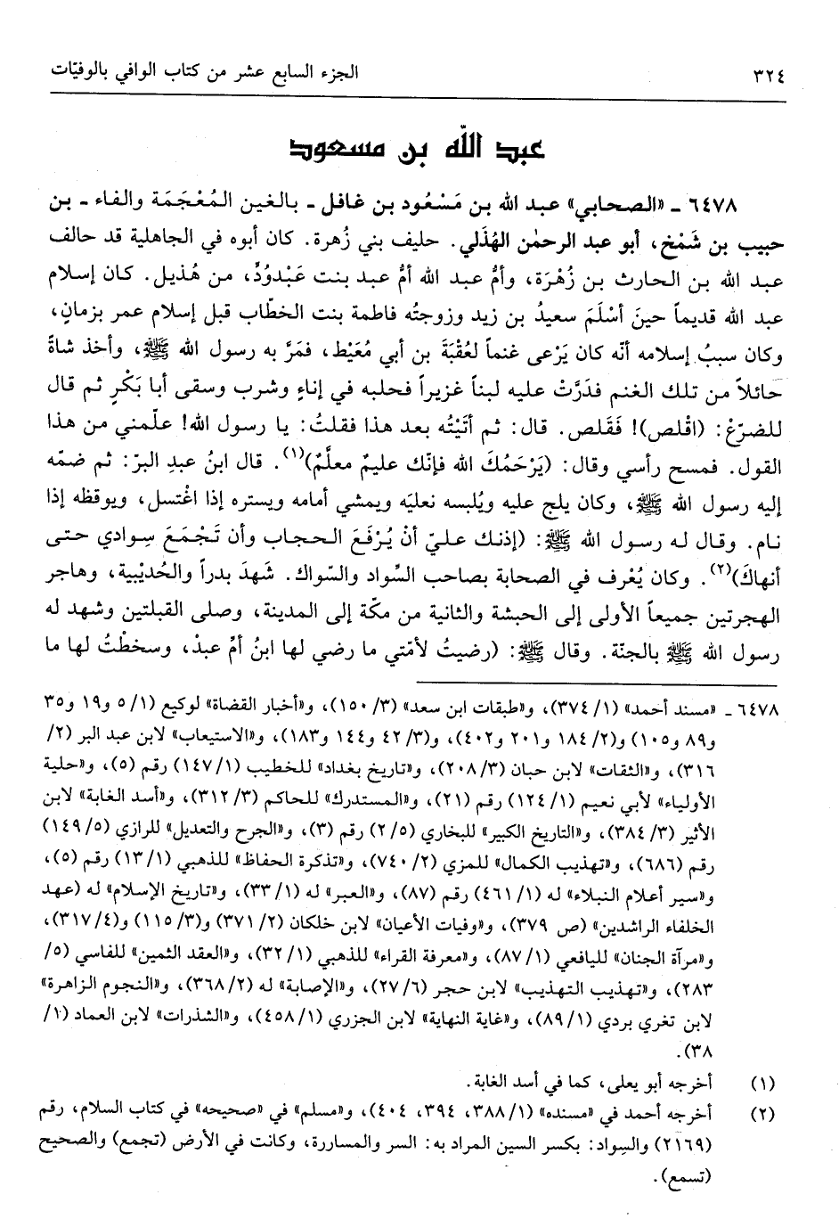 الصَّحَابِيّ عبد الله بن مَسْعُود بن غافل بالغين الْمُعْجَمَة وَالْفَاء بن حبيب ابْن شمخ أَبُو عبد الرحمان الْهُذلِيّ حَلِيف بني زهرَة كَانَ أَبوهُ فِي الْجَاهِلِيَّة قد حَالف عبد الله بن الْحَارِث بن زهرَة وَأم عبد الله أم عبد بنت عبدودٍ من هُذَيْل كَانَ إِسْلَام عبد الله قَدِيما حِين أسلم سعيد بن زيد وَزَوجته فَاطِمَة بنت الْخطاب قبل إِسْلَام عمر بزمانٍ وَكَانَ سَبَب إِسْلَامه أَنه كَانَ يرْعَى غنما لعقبة بن أبي معيط فَمر بِهِ رَسُول الله صلى الله عَلَيْهِ وَسلم وَأخذ شَاة حَائِلا من تِلْكَ الْغنم فَدرت علينا لَبَنًا غزيراً فحلبه فِي إناءٍ وَشرب وَسَقَى أَبَا بكرٍ ثمَّ قَالَ للضرع اقلص فقلص