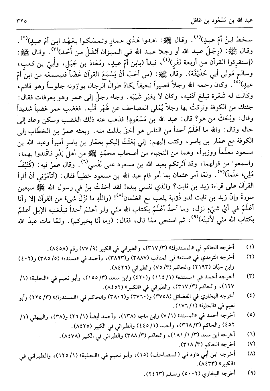 وَقَالَ صلى الله عَلَيْهِ وَسلم رجل عبد الله أَو رجلا عبد الله فِي الْمِيزَان أثقل من أحد وَقَالَ صلى الله عَلَيْهِ وَسلم إستقرأوا الْقُرْآن من أَرْبَعَة نفرٍ فَبَدَأَ بِابْن أم عبدٍ ومعاذ بن جبلٍ وَأبي بن كعبٍ وَسَالم مولى أبي حُذَيْفَة وَقَالَ صلى الله عَلَيْهِ وَسلم من أحب أَن يسمع الْقُرْآن غضاً فليسمعه من ابْن أم عبدٍ وَكَانَ رَحمَه الله رجلا قَصِيرا نحيفاً يكَاد طوال الرِّجَال يوازونه جُلُوسًا وَهُوَ قَائِم وَكَانَت لَهُ شَعْرَة تبلغ أُذُنَيْهِ وَكَانَ لَا يُغير شَيْبه وَجَاء رجلٌ إِلَى عمر وَهُوَ بِعَرَفَات فَقَالَ جئْتُك من الْكُوفَة ونركت بهَا رجلا يملي الْمَصَاحِف عَن ظهر قلبه فَغَضب عمر غَضبا شَدِيدا وَقَالَ وَيحك من هُوَ قَالَ عبد الله بن مسعودٍ فَذهب عَنهُ ذَلِك الْغَضَب وَسكن وَعَاد إِلَى حَاله وَقَالَ وَالله مَا أعلم أحدا من النَّاس هُوَ أَحَق بذلك مِنْهُ وَبَعثه عمر بن الْخطاب إِلَى الْكُوفَة مَعَ عمار بن يَاسر وَكتب إِلَيْهِم إِنِّي بعثت إِلَيْكُم بِعَمَّار بن ياسرٍ أَمِيرا)