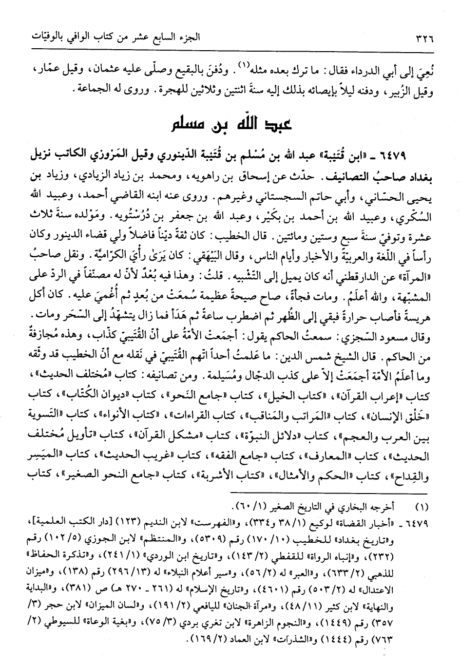 وَقَالَ مَسْعُود السجْزِي سَمِعت الْحَاكِم يَقُول أَجمعت الْأمة على أَن القتيبي كَذَّاب وَهَذِه مجازفةٌ من الْحَاكِم قَالَ الشَّيْخ شمس الدّين مَا علمت أحدا اتهمَ القتيبي فِي نَقله مَعَ أَن الْخَطِيب قد وَثَّقَهُ وَمَا أعلم الْأمة أَجمعت إِلَّا على كذب الدَّجَّال ومسيلمة وَمن تصانيفه كتاب مُخْتَلف الحَدِيث كتاب إِعْرَاب الْقُرْآن كتاب الْخَلِيل كتاب جَامع النَّحْو كتاب ديوَان الْكتاب كتاب خلق)