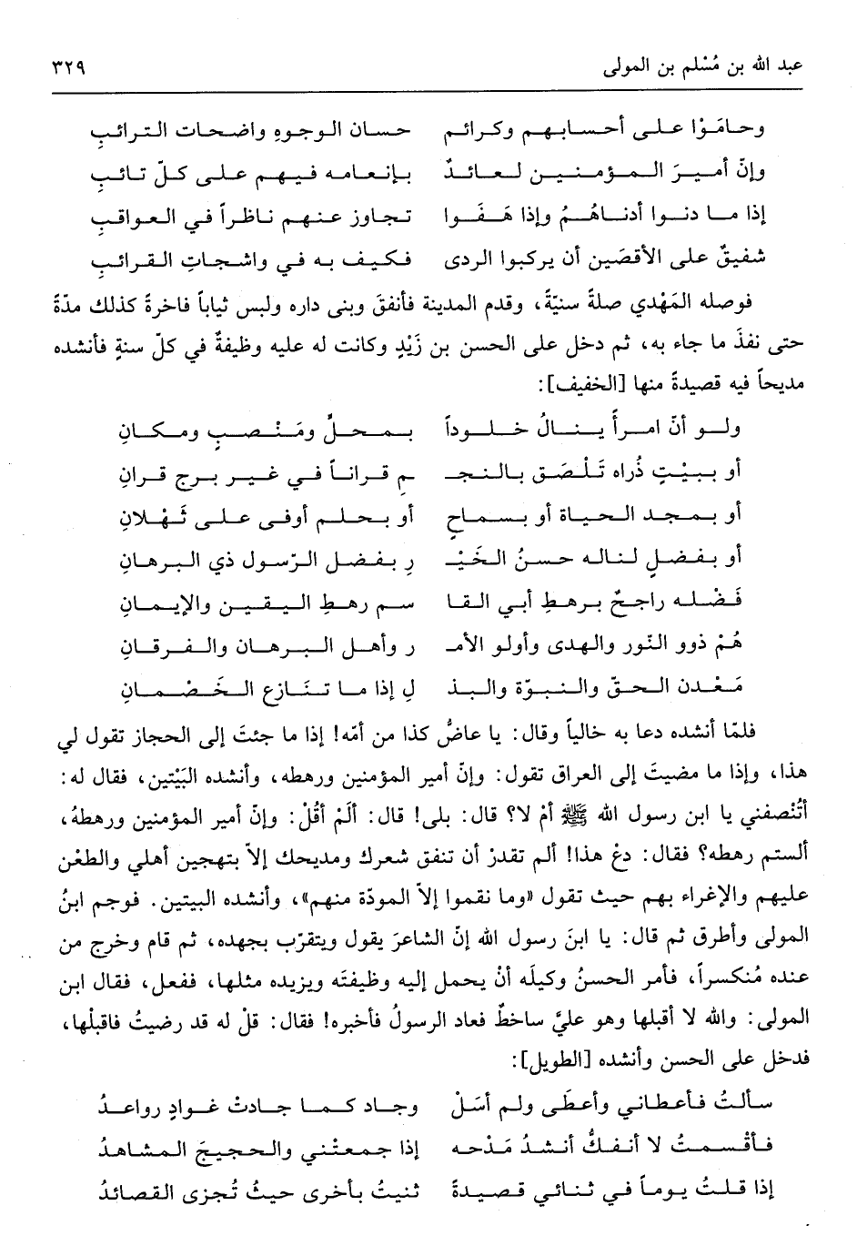 فَلَمَّا أنْشدهُ دَعَا بِهِ خَالِيا وَقَالَ يَا عاض كَذَا من أمه إِذا مَا جِئْت إِلى الْحجاز تَقول لي هَذَا وَإِذا مَا مضيت إِلى الْعرَاق تَقول وَإِن أَمِير الْمُؤمنِينَ ورهطه وأنشده الْبَيْتَيْنِ فَقَالَ لَهُ أتنصفني يَا ابْن رَسُول الله صلى الله عَلَيْهِ وَسلم أم لَا قَالَ بلَى قَالَ ألم أقل وَإِن أَمِير الْمُؤمنِينَ ورهطه ألستم رهطه فَقَالَ دع هَذَا ألم تقدر أَن تنْفق شعرك ومديحك إِلَّا بتهجين أَهلِي والطعن عَلَيْهِم والإغراء بهم حَيْثُ تَقول وَمَا نقموا إِلَّا الْمَوَدَّة مِنْهُم وأنشده الْبَيْتَيْنِ فَوَجَمَ ابْن الْمولى وأطرق ثمَّ قَالَ يَا ابْن رَسُول الله إِن الشَّاعِر يَقُول ويتقرب بِجهْدِهِ ثمَّ قَامَ وَخرج من عِنْده منكسراً فَأمر الْحسن وَكيله أَن يحمل إِلَيْهِ وظيفته ويزيده مثلهَا فَفعل فَقَالَ ابْن الْمولى وَالله لَا ٌأقبلها وَهُوَ عَليّ ساخط فَعَاد رَسُول فَأخْبرهُ فَقَالَ قل لَهُ قد رضيت فأقبلها فَدخل على الْحسن وأنشده من الطَّوِيل