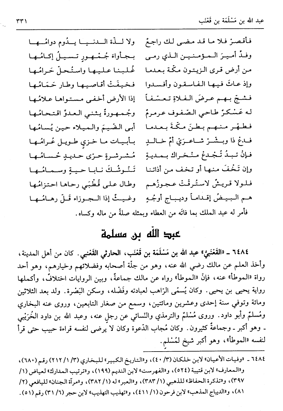 القعْنبِي عبد الله بن مسلمة بن قعنب الْحَارِثِيّ القعْنبِي كَانَ من أهل الْمَدِينَة وَأخذ الْعلم عَن مَالك رَضِي الله عَنهُ وَهُوَ من جلة أَصْحَابه وفضلائهم وخيارهم وَهُوَ أحد رُوَاة الْمُوَطَّأ عَنهُ فَإِن الْمُوَطَّأ رَوَاهُ عَن مَالك جماعةٌ وَبَين الرِّوَايَات اختلافٌ وأكملها رِوَايَة يحيى ابْن يحيى وَكَانَ يُسمى الراهب لعبادته وفضله وَسكن الْبَصْرَة ولد بعد الثَّلَاثِينَ وَمِائَة وَتُوفِّي سنة إِحْدَى وَعشْرين وَمِائَتَيْنِ وَسمع من صغَار التَّابِعين وروى عَنهُ البُخَارِيّ ومسلمٌ وَأَبُو دَاوُد وروى مسلمٌ وَالتِّرْمِذِيّ وَالنَّسَائِيّ عَن رجلٍ عَنهُ وَعبد الله بن دَاوُد الْخُرَيْبِي وَهُوَ أكبر وجماعةٌ كَثِيرُونَ وَكَانَ مجاب الدعْوَة وَكَانَ لَا يرضى لنَفسِهِ قِرَاءَة حبيب حَتَّى قَرَأَ لنَفسِهِ الْمُوَطَّأ وَهُوَ أكبر شيخ لمسلمٍ