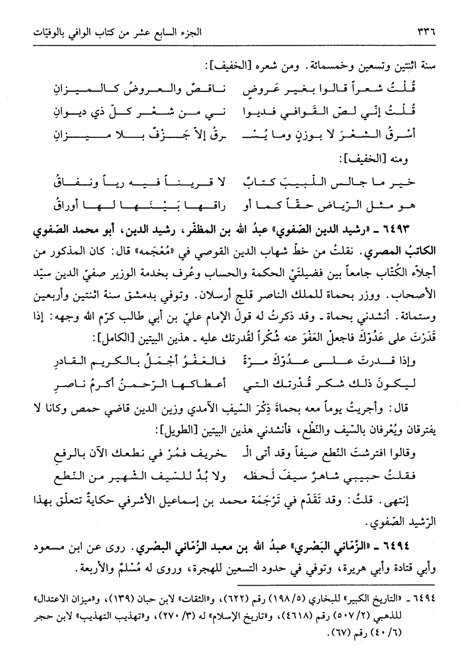 رشيد الدّين الصفوي عبد الله بن المظفر رشيد الدّين أَبُو مُحَمَّد الصفوي الْكَاتِب الْمصْرِيّ نقلت من خطّ شهَاب الدّين القوصي فِي مُعْجَمه قَالَ كَانَ الْمَذْكُور من أجلاء الْكتاب جَامعا بَين فضيلتي الْحِكْمَة والحساب وَعرف بِخِدْمَة الْوَزير صفي الدّين سيد الْأَصْحَاب ووزر بحماة للْملك النَّاصِر قلج أرسلان وَتُوفِّي بِدِمَشْق سنة اثْنَتَيْنِ وَأَرْبَعين وسِتمِائَة أَنْشدني بحماة وَقد ذكرت لَهُ قَول الامام عَليّ بن أبي طَالب كرم الله وَجهه إِذا قدرت على عَدوك فَاجْعَلْ الْعَفو عَنهُ شكرا لقدرتك عَلَيْهِ هذَيْن الْبَيْتَيْنِ من الْكَامِل