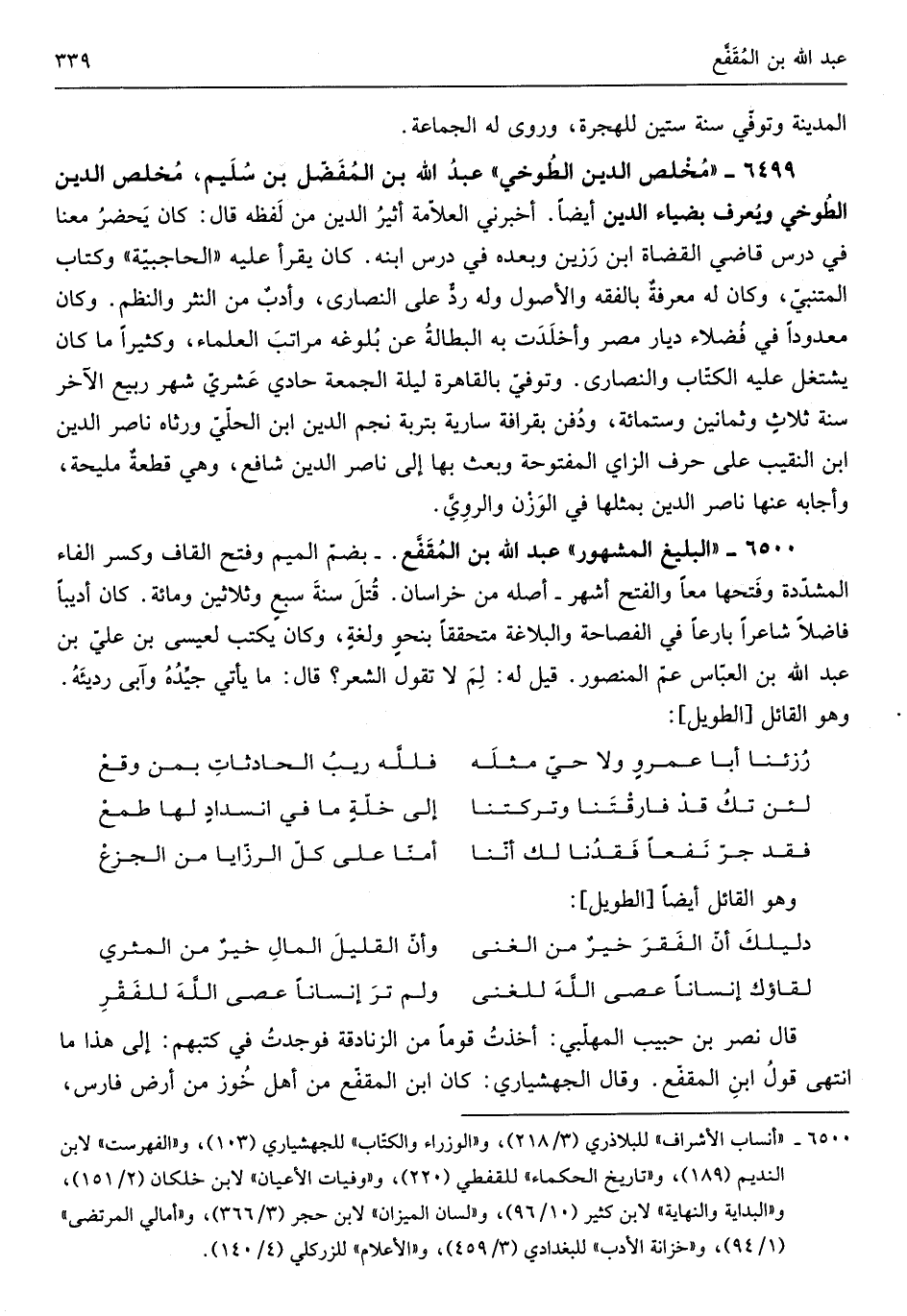 البليغ الْمَشْهُور عبد الله بن المقفع بِضَم وَفتح الْقَاف وَكسر الْفَاء الْمُشَدّدَة وَفتحهَا مَعًا وَالْفَتْح أشهر أَصله من خُرَاسَان قتل سنة سبعٍ وَثَلَاثِينَ وَمِائَة كَانَ أديباً فَاضلا شَاعِرًا بارعاً فِي الفصاحة والبلاغة متحققاً بنحوٍ ولغةٍ وَكَانَ يكْتب لعيسى بن عَليّ بن عبد الله بن الْعَبَّاس عَم الْمَنْصُور