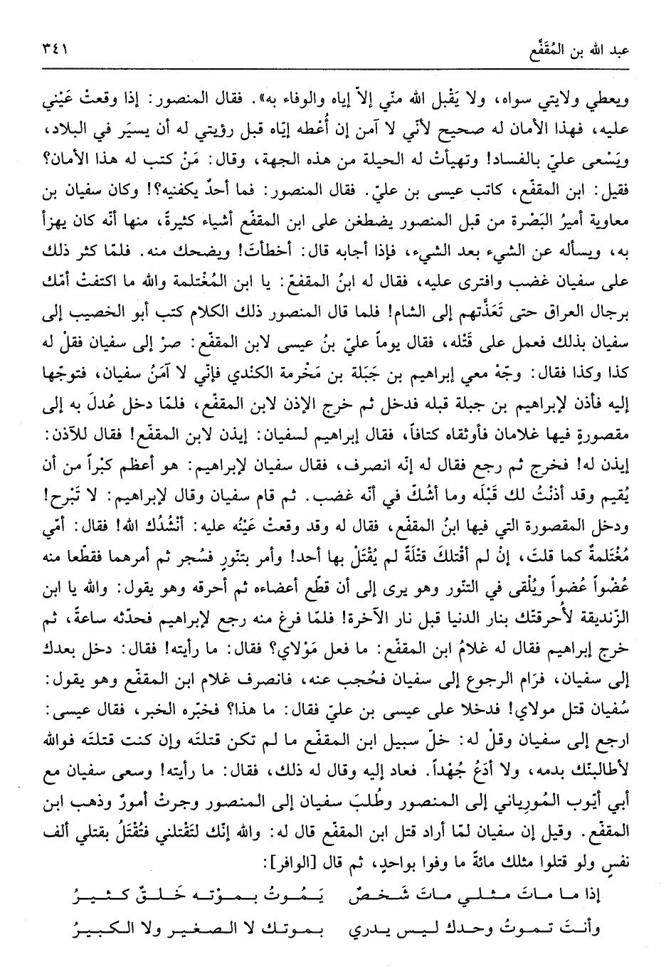 فَقَالَ الْمَنْصُور إِذا وَقعت عَيْني عَلَيْهِ فَهَذَا الْأمان لَهُ صَحِيح لِأَنِّي لَا آمن إِن أعْطه إِيَّاه قبل رؤيتي لَهُ أَن يسير فِي الْبِلَاد وَيسْعَى عَليّ بِالْفَسَادِ وتهيأت لَهُ الْحِيلَة من هَذِه الْجِهَة وَقَالَ من كتب لَهُ هَذَا الْأمان فَقيل ابْن المقفع كَاتب عِيسَى بن عَليّ فَقَالَ الْمَنْصُور فَمَا أحدٌ يكفنيه وَكَانَ سُفْيَان بن مُعَاوِيَة أَمِير الْبَصْرَة من قبل الْمَنْصُور يضطغن على ابْن المقفع أَشْيَاء كَثِيرَة مِنْهَا أَنه كَانَ يهزأ بِهِ ويسأله عَن الشَّيْء بعد الشَّيْء فَإِذا أَجَابَهُ قَالَ أَخْطَأت ويضحك مِنْهُ فَلَمَّا كثر ذَلِك على سُفْيَان غضب وافترى عَلَيْهِ فَقَالَ لَهُ ابْن المقفع يَا ابْن المغتلمة وَالله مَا اكتفت أمك بِرِجَال الْعرَاق حَتَّى تعدتهم إِلَى الشَّام فَلَمَّا قَالَ الْمَنْصُور ذَلِك الْكَلَام كتب أَبُو الخصيب إِلَى سُفْيَان بذلك فَعمل على قَتله فَقَالَ يَوْمًا عَليّ بن عِيسَى لِابْنِ المقفع صر إِلَى سُفْيَان فَقل لَهُ كَذَا وَكَذَا فَقَالَ وَجه معي إِبْرَاهِيم بن جبلة بن مَخْزَمَةَ الْكِنْدِيّ فَإِنِّي لَا آمن سُفْيَان فتوجها إِلَيْهِ فَأذن لإِبْرَاهِيم بن جبلة قبله فَدخل ثمَّ خرج الْإِذْن لِابْنِ المقفع فَلَمَّا دخل عدل بِهِ إِلَى مقصورةٍ فِيهَا غلامان فَأَوْثَقَاهُ كتافاً فَقَالَ إِبْرَاهِيم لِسُفْيَان ايذن لِابْنِ المقفع فَقَالَ للآذن ايذن لَهُ فَخرج ثمَّ رَجَعَ فَقَالَ لَهُ إِنَّه انْصَرف فَقَالَ سُفْيَان لإِبْرَاهِيم هُوَ أعظم كبرا من أَن يُقيم وَقد أَذِنت لَك قبله وَمَا أَشك فِي أَنه غضب ثمَّ قَامَ سُفْيَان وَقَالَ لإِبْرَاهِيم لَا تَبْرَح وَدخل الْمَقْصُورَة الَّتِي فِيهَا ابْن المقفع فَقَالَ لَهُ وَقد وَقعت عينه عَلَيْهِ أنْشدك الله فَقَالَ أُمِّي مغتلمةٌ كَمَا قلت إِن لم أَقْتلك قتلةً لم يقتل بهَا أحد وَأمر بتنورٍ فسجر ثمَّ أَمرهمَا فقطعا مِنْهُ عضوا عضوا ويلقى فِي التَّنور وَهُوَ يرى إِلَى أَن قطع أعضاءه ثمَّ أحرقه وَهُوَ يَقُول وَالله يَا ابْن الزنديقة لأحرقنك بِنَار الدُّنْيَا قبل نَار الْآخِرَة فَلَمَّا فرغ مِنْهُ رَجَعَ لإِبْرَاهِيم فحدثه سَاعَة ثمَّ خرج إِبْرَاهِيم فَقَالَ لَهُ غُلَام ابْن المقفع مَا فعل مولَايَ فَقَالَ مَا رَأَيْته فَقَالَ دخل بعْدك إِلَى سُفْيَان فرام الرُّجُوع إِلَى سُفْيَان فحجب عَنهُ فَانْصَرف غُلَام ابْن المقفع وَهُوَ يَقُول سُفْيَان قتل مولَايَ فدخلا على عِيسَى ابْن عَليّ فَقَالَ مَا هَذَا فخبره الْخَبَر فَقَالَ عِيسَى إرجع إِلَى سُفْيَان وَقل لَهُ خل سَبِيل ابْن المقفع مَا لم تكن قتلته وَإِن كنت قتلته فوَاللَّه لأطالبنك بدمه وَلَا أدع جهداً فَعَاد إِلَيْهِ وَقَالَ لَهُ ذَلِك فَقَالَ مَا رَأَيْته وسعى سُفْيَان مَعَ)