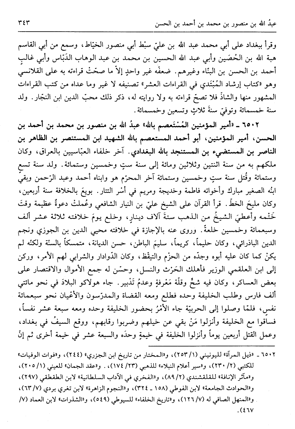 أَمِير الْمُؤمنِينَ المستعصم بِاللَّه عبد الله بن مَنْصُور بن مُحَمَّد بن أَحْمد بن الْحسن أَمِير الْمُؤمنِينَ أَبُو أَحْمد المستعصم بِاللَّه الشَّهِيد ابْن الْمُسْتَنْصر بن الظَّاهِر بن النَّاصِر بن المستضيء بن المستنجد بِاللَّه الْبَغْدَادِيّ آخر خلفاء العباسيين بالعراق وَكَانَ ملكهم بِهِ من سنة اثْنَتَيْنِ وَثَلَاثِينَ وَمِائَة إِلَى سنة ستٍ وَخمسين وسِتمِائَة ولد سنة تسعٍ وسِتمِائَة وَقتل سنة ستٍ وَخمسين وسِتمِائَة آخر الْمحرم هُوَ وابناه أَحْمد وَعبد الرحمان وَبَقِي ابْنه الصَّغِير مبارك وأخواته فَاطِمَة وَخَدِيجَة وَمَرْيَم فِي أسر التتار بُويِعَ بالخلافة سنة أَرْبَعِينَ وَكَانَ مليح الْخط قَرَأَ الْقُرْآن على الشَّيْخ عَليّ بن النيار الشَّافِعِي وعملت دعوةٌ عَظِيمَة وَقت خَتمه وَأعْطِي الشَّيْخ من الذَّهَب سِتَّة آلَاف دينارٍ وخلع يَوْم خِلَافَته ثَلَاثَة عشر ألف وَسبع مائَة وَخمسين خلعةً وروى عَنهُ بِالْإِجَازَةِ فِي خِلَافَته محيي الدّين ابْن الْجَوْزِيّ وَنجم الدّين الباذرائي وَكَانَ حَلِيمًا كَرِيمًا سليم الْبَاطِن حسن الدّيانَة متمسكاً بِالسنةِ وَلكنه لم يكن كَمَا كَانَ عَلَيْهِ أَبوهُ وجده من الحزم والتيقظ وَكَانَ الدوادار والشرابي لَهُم الْأَمر وركن إِلَى ابْن العلقمي الْوَزير فَأهْلك الْحَرْث والنسل وَحسن لَهُ جمع الْأَمْوَال والاقتصار على)