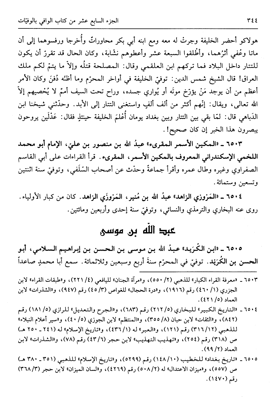 هولاكو أحضر الْخَلِيفَة وَجَرت لَهُ مَعَه وَمَعَ ابْنه أبي بكر محاوراتٌ وأخرجاورفسوهما إِلَى أَن مَاتَا وعفي أثرهما وأطلقوا السَّبْعَة عشر وأعطوهم نشابة وَكَانَ الْحَال قد تقرر أَن يكون للتتار دَاخل الْبِلَاد فَلَمَّا تَركهم ابْن العلقمي وَقَالَ الْمصلحَة قَتله وَإِلَّا مَا يتم لكم ملك الْعرَاق قَالَ الشَّيْخ شمس الدّين توفّي الْخَلِيفَة فِي أَوَاخِر الْمحرم وَمَا أَظُنهُ دفن وَكَانَ الْأَمر أعظم من أَن يُوجد من يؤرخ مَوته أَو يواري جسده وَرَاح تَحت السَّيْف أممٌ لَا يحصيهم إِلَّا الله تَعَالَى وَيُقَال إِنَّهُم أَكثر من ألف ألفٍ وَاسْتغْنى التتار إِلَى الْأَبَد وحَدثني شَيخنَا ابْن الدباهي قَالَ لما بَقِي بَين التتار وَبَين بَغْدَاد يَوْمَانِ أعلم الْخَلِيفَة حينئذٍ فَقَالَ عَدْلَيْنِ يروحون يبصرون هَذَا الْخَبَر إِن كَانَ صَحِيح