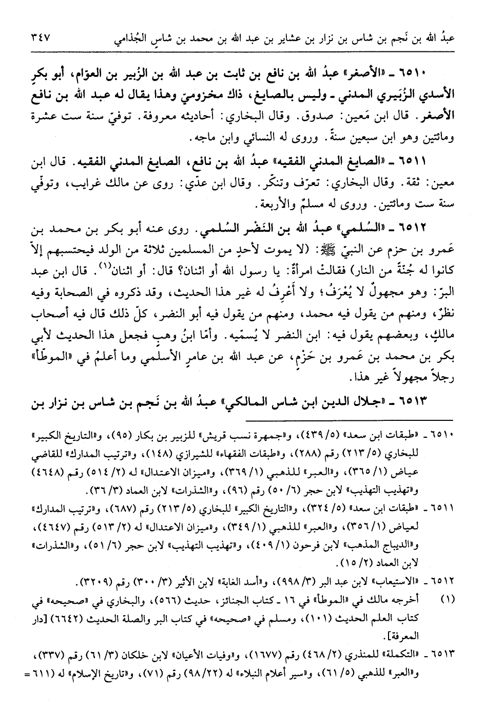 السّلمِيّ عبد الله بن النَّضر السّلمِيّ روى عَنهُ أَبُو بكر بن مُحَمَّد بن عَمْرو بن حزم عَن النَّبِي صلى الله عَلَيْهِ وَسلم لَا يَمُوت لأحدٍ من الْمُسلمين ثَلَاثَة من الْوَلَد فيحتسبهم إِلَّا كَانُوا لَهُ جنَّة من النَّار فَقَالَت إمرأةٌ يَا رَسُول الله أَو اثْنَان قَالَ أَو اثْنَان قَالَ ابْن عبد الْبر وَهُوَ مجهولٌ لَا يعرف وَلَا أعرف لَهُ غير هَذَا الحَدِيث وَقد ذَكرُوهُ فِي الصَّحَابَة وَفِيه نظرٌ وَمِنْهُم من يَقُول فِيهِ مُحَمَّد وَمِنْهُم من يَقُول فِيهِ أَبُو النَّضر كل ذَلِك قَالَ فِيهِ أَصْحَاب مالكٍ وَبَعْضهمْ يَقُول فِيهِ)