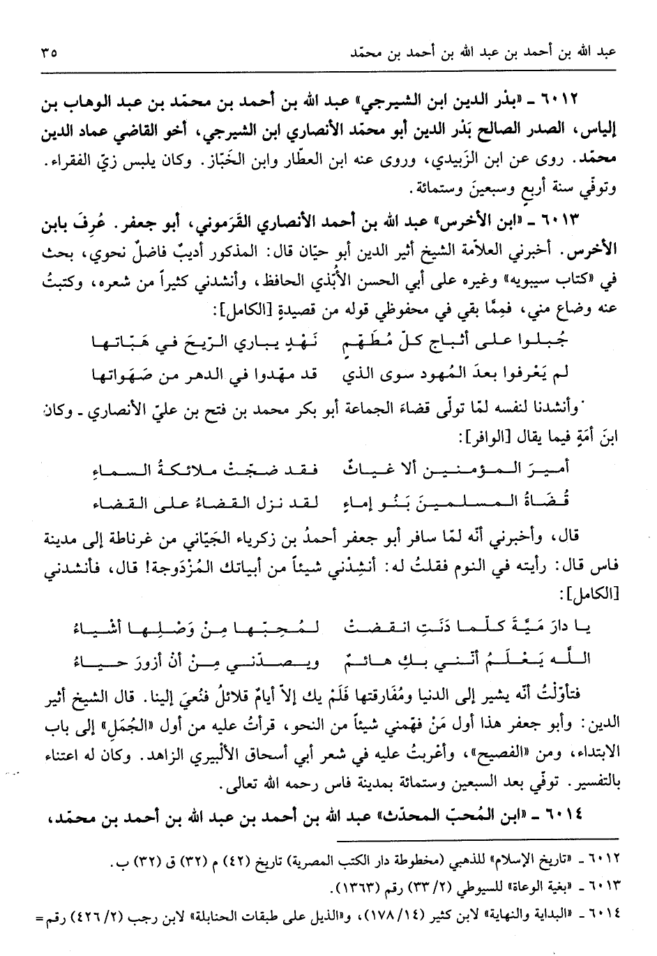 عبد الله بن أَحْمد الْأنْصَارِيّ القرموني أَبُو جَعْفَر عرف بِابْن الْأَخْرَس أَخْبرنِي الْعَلامَة الشَّيْخ أثير الدّين أَبُو حَيَّان قَالَ الْمَذْكُور أديبٌ فاضلٌ نحوي بحث فِي كتاب سِيبَوَيْهٍ وَغَيره على أبي الْحسن الأُبذي الْحَافِظ وأنشدني كثيرا من شعره وكتبتُ عَنهُ وَضاع مني فمما بَقِي فِي محفوظي قَوْله من قصيدة من الْكَامِل