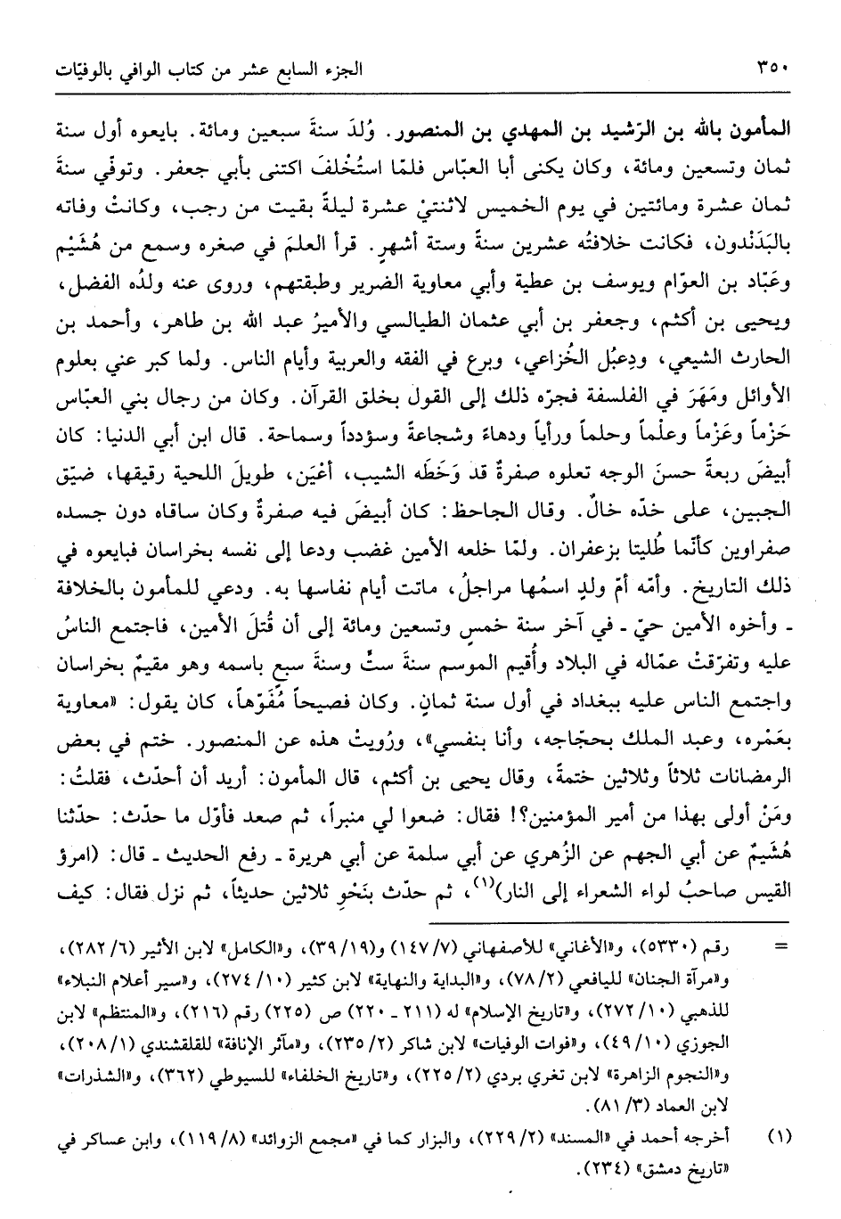 الْمَأْمُون بِاللَّه بن الرشيد ابْن الْمهْدي بن الْمَنْصُور ولد سنة سبعين وَمِائَة بَايعُوهُ أول سنة ثَمَان وَتِسْعين وَمِائَة وَكَانَ يكنى أَبَا الْعَبَّاس فَلَمَّا اسْتخْلف اكتنى بِأبي جَعْفَر وَتُوفِّي سنة ثَمَان عشرَة وَمِائَتَيْنِ فِي يَوْم الْخَمِيس لِاثْنَتَيْ عشرَة لَيْلَة بقيت من رَجَب وَكَانَت وَفَاته بالبدنون فَكَانَت خِلَافَته عشْرين سنة وَسِتَّة أشهرٍ قَرَأَ الْعلم فِي صغره وَسمع من هشيم وَعباد بن الْعَوام ويوسف بن عَطِيَّة وَأبي مُعَاوِيَة الضَّرِير وطبقتهم وروى عَنهُ وَلَده الْفضل وَيحيى بن أَكْثَم وجعفر ابْن أبي عُثْمَان الطَّيَالِسِيّ والأمير عبد الله ابْن طَاهِر وَأحمد بن الْحَارِث الشيعي ودعل الْخُزَاعِيّ وبرع فِي الْفِقْه والعربية وَأَيَّام النَّاس وَلما كبر عني بعلوم الْأَوَائِل وَمهر فِي الفلسفة فجره ذَلِك إِلَى القَوْل بِخلق الْقُرْآن
